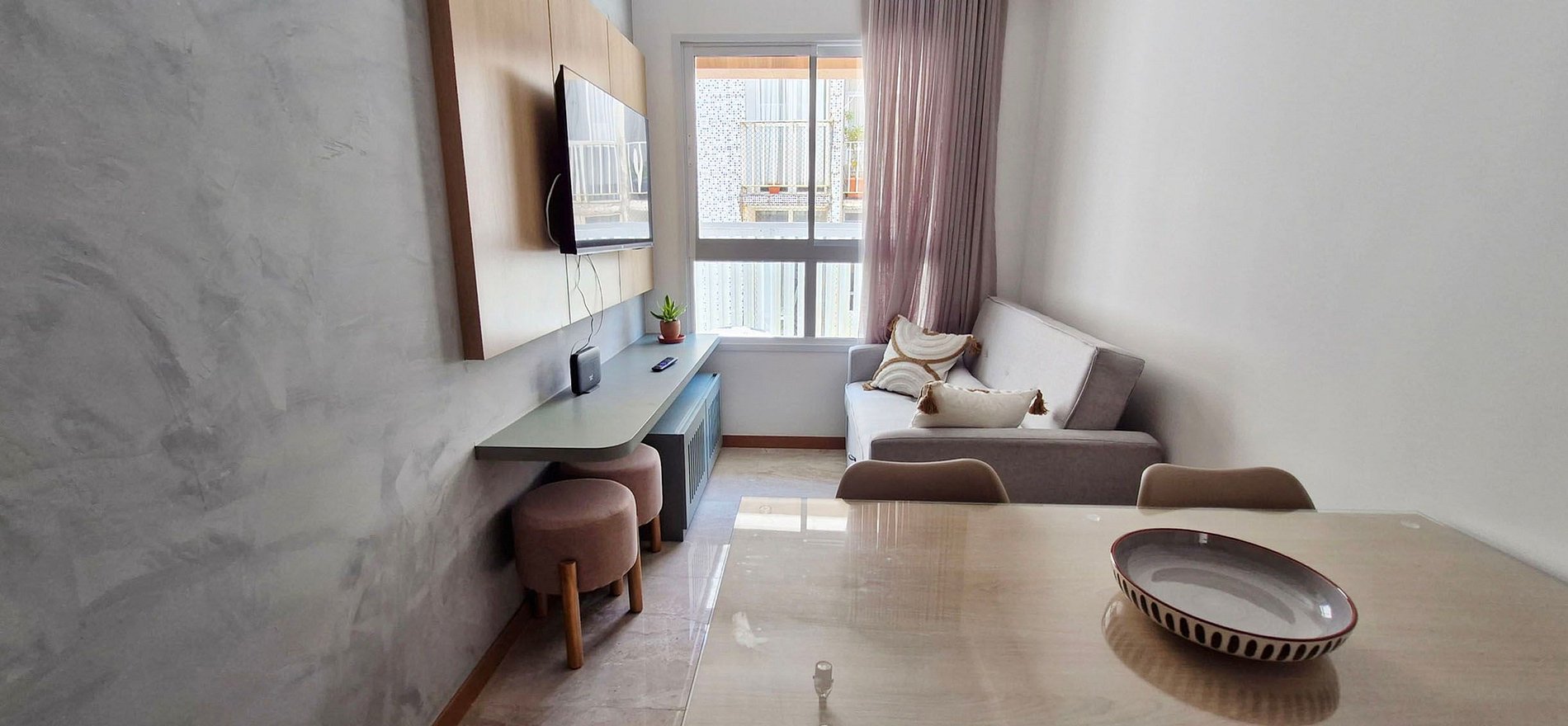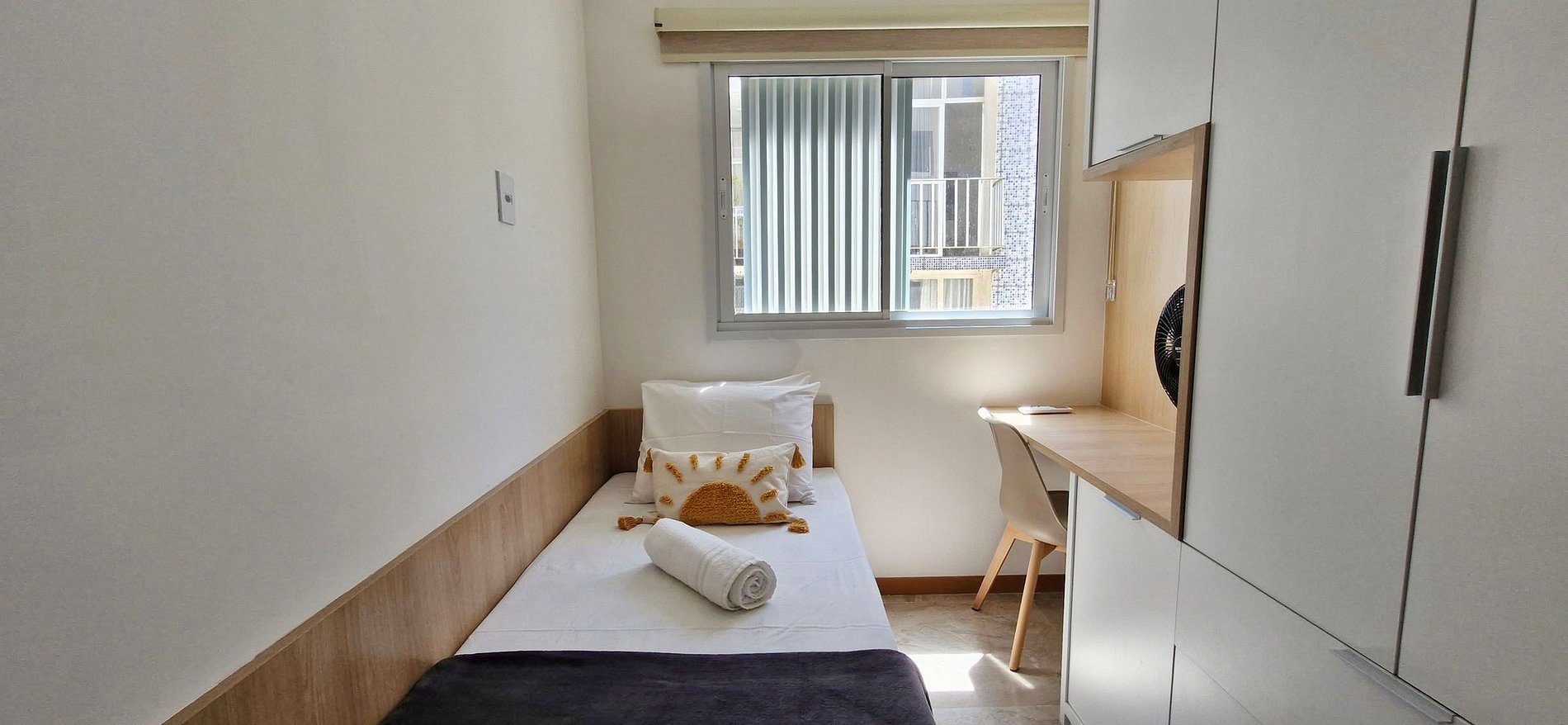 2/4 apartment with 30m², well decorated, in Costa Azul! 5min from the beach, close to supermarket, pharmacy and shops. Bedroom (1) with double bed, split air conditioning, wardrobe. Bedroom (2) with single bed, work area, split air conditioning and wardrobe. Living room with smart TV and sofa. Equipped kitchen. Gym, swimming pool, co-working, 1 rotating parking space (only small vehicles).