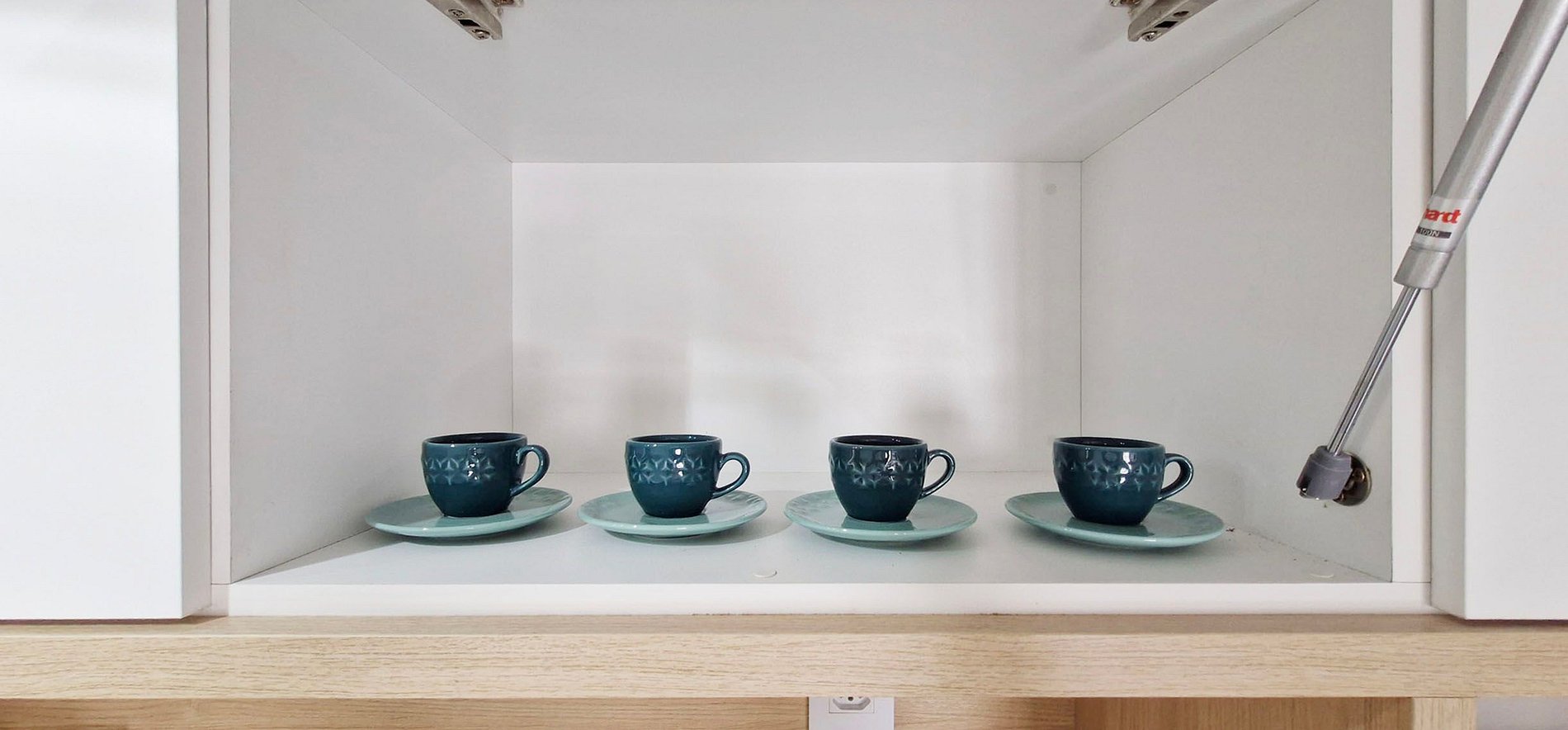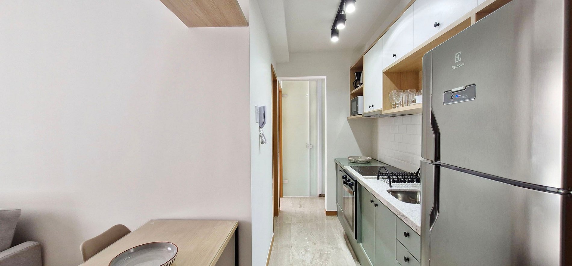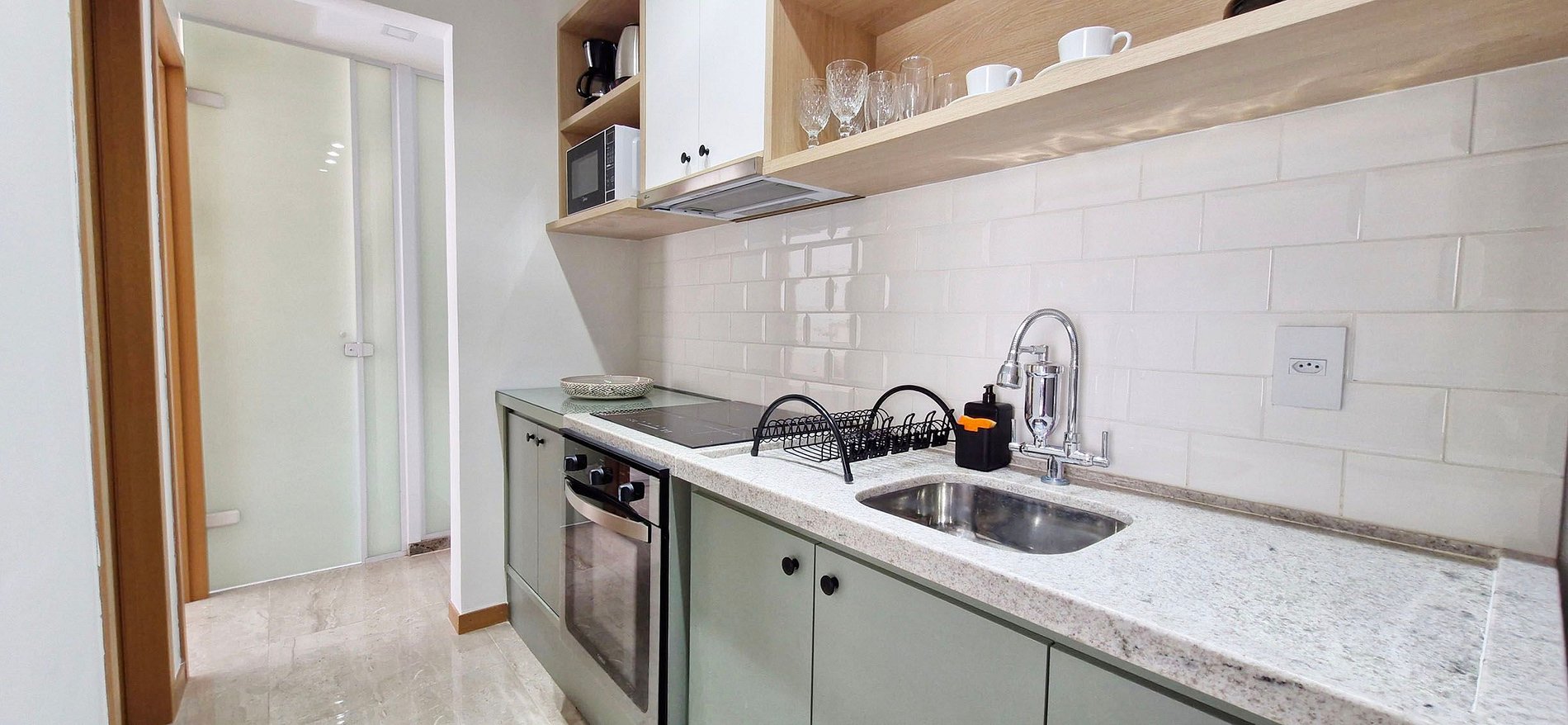 - Counter with 2 chairs, duplex refrigerator, electric oven, induction cooktop with 4 burners, air purifier, water filter, microwave, sandwich maker, blender, electric coffee maker, electric kettle, pans, cutlery, plates and basic kitchen items.