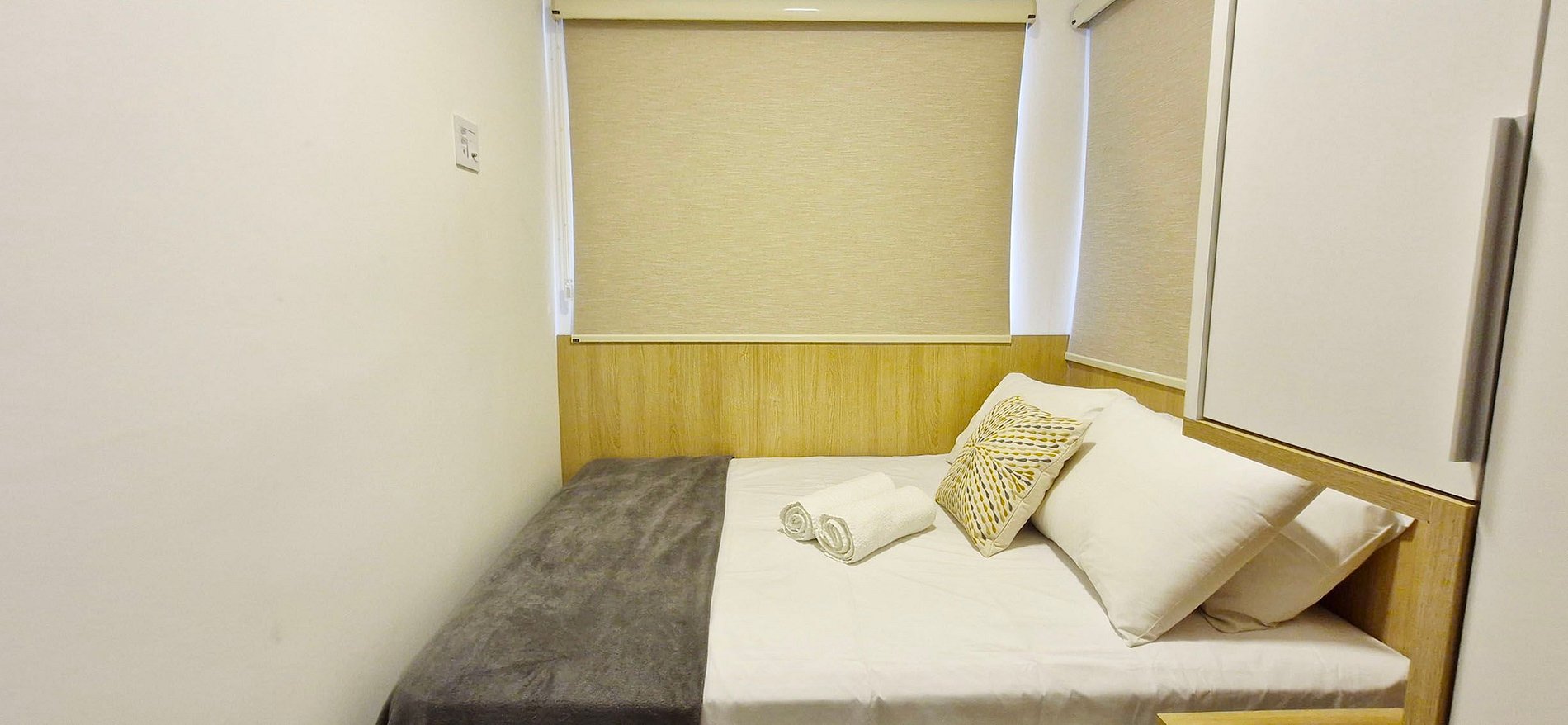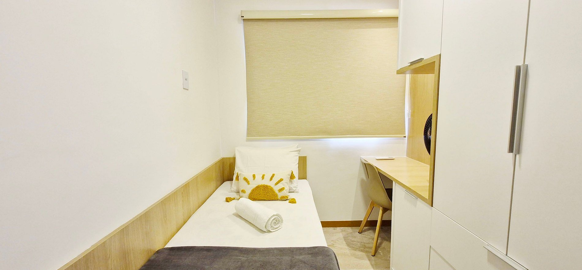 - Single bed, fitted wardrobe with desk, chair, table fan, split air conditioning, blackout curtains