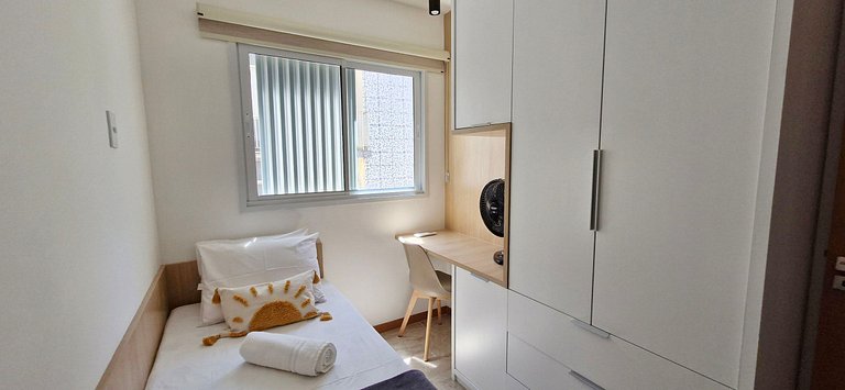 2/4 apartment with 30m², well decorated, in Costa Azul! 5min from the beach, close to supermarket, pharmacy and shops. Bedroom (1) with double bed, split air conditioning, wardrobe. Bedroom (2) with single bed, work area, split air conditioning and wardrobe. Living room with smart TV and sofa. Equipped kitchen. Gym, swimming pool, co-working, 1 rotating parking space (only small vehicles).