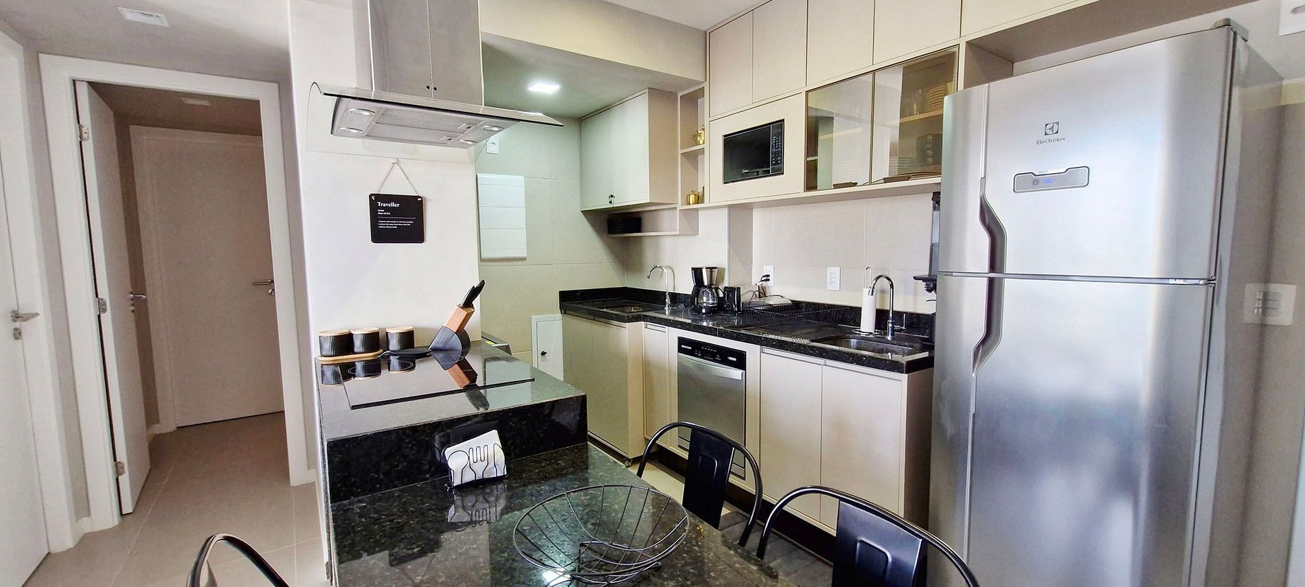 - KITCHEN: American counter with 2 chairs, intercom, airfryer, water filter, duplex refrigerator, 4-burner cooktop, dishwasher, air purifier, electric oven, microwave, blender, sandwich maker, toaster, electric coffee maker, thermos, glasses, cups, pots and basic kitchen utensils