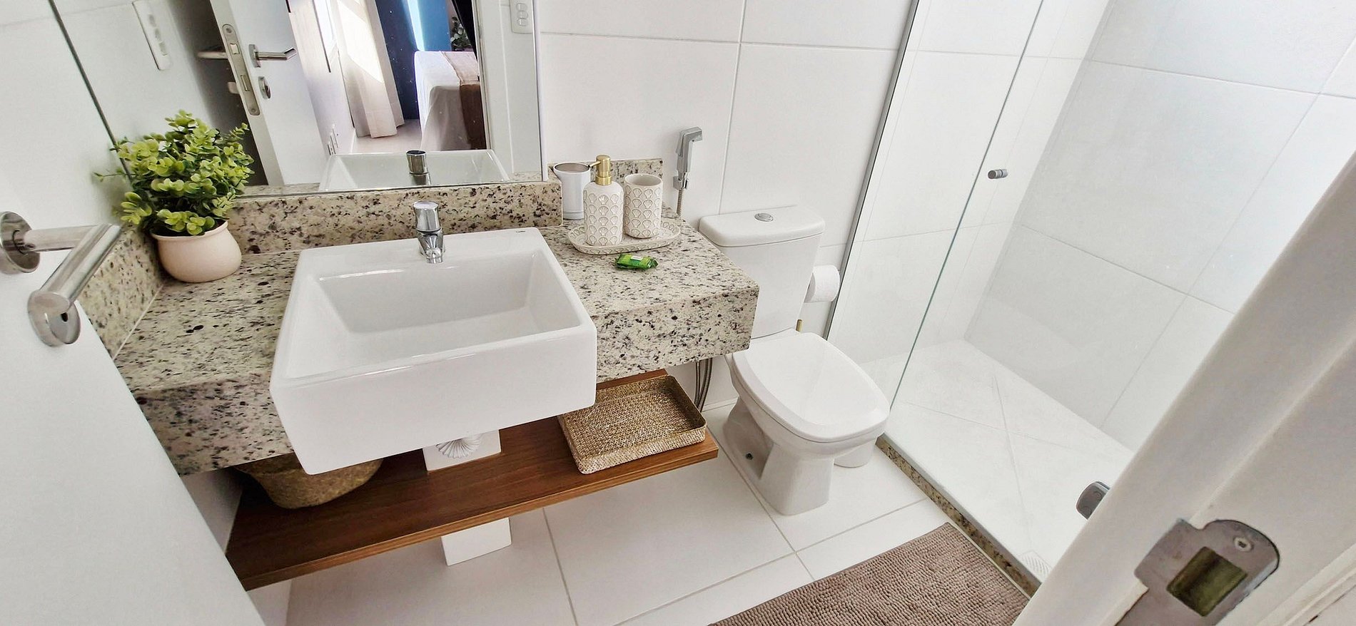 - SUITE: queen bed, lamp, rug, smart TV with apps and local channels, wardrobe with mirror, split air conditioning, ceiling fan with remote control, blackout curtain, bag and straw hat.