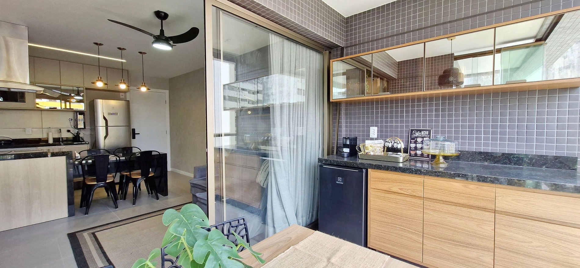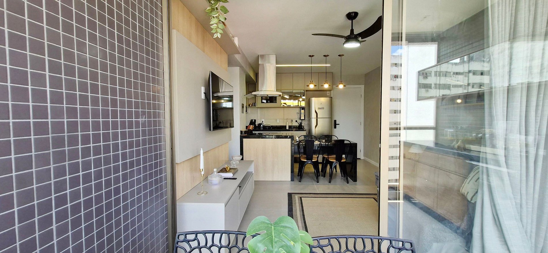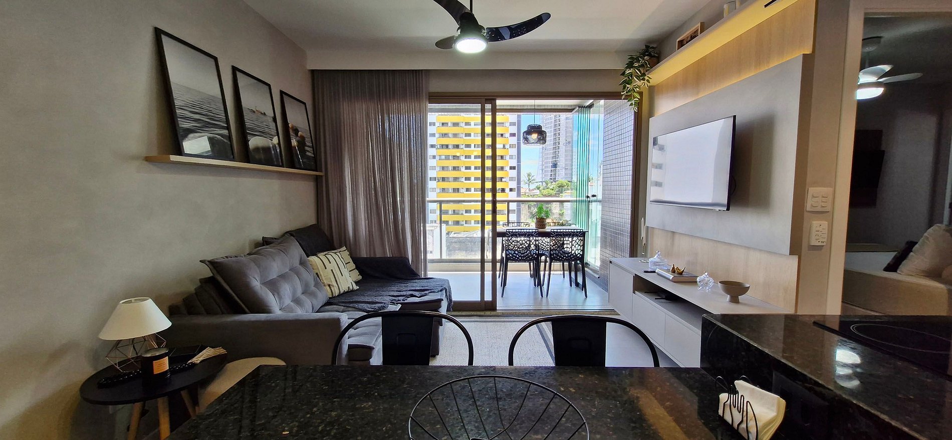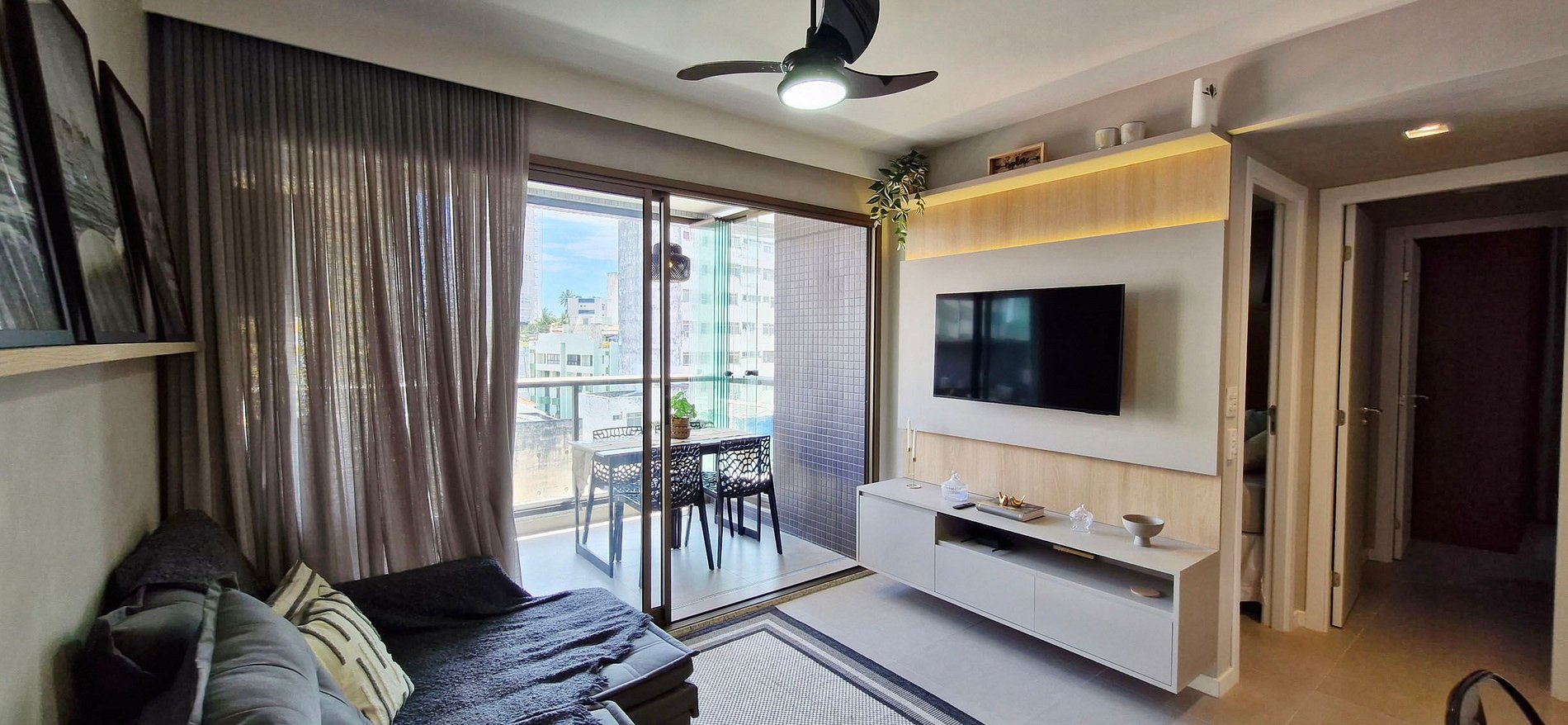 - LIVING ROOM: ceiling fan, smart TV panel with apps and local channels, WI-FI, sofa bed (the space is small, not recommended for adults), drawer with headphones and games (uno and dominoes), rug, side table with lamp, spotlights and thin curtain (not blackout)