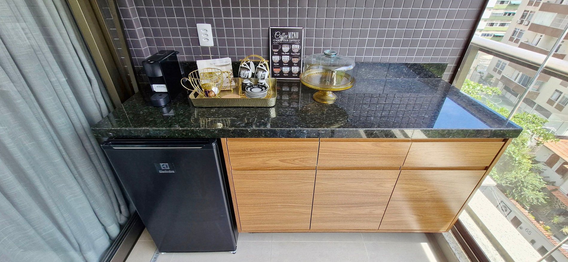 - BALCONY: table with 4 chairs, Reikki window, minibar, capsule coffee maker, glasses, cups, plates, electric kettle