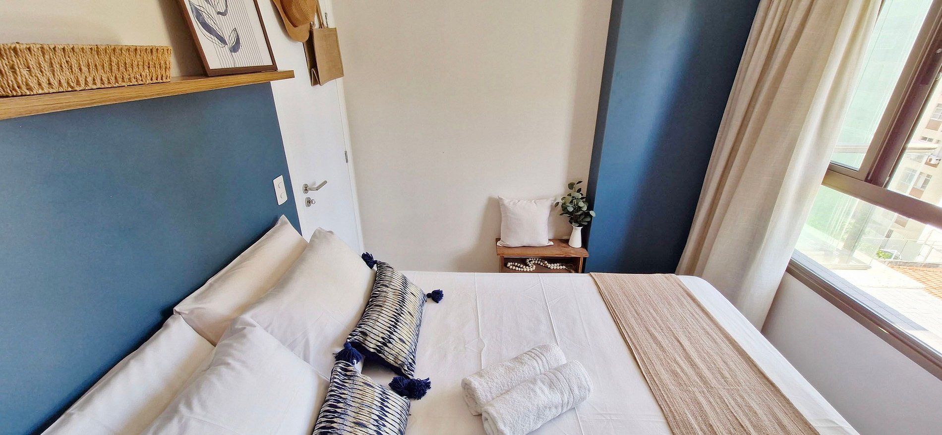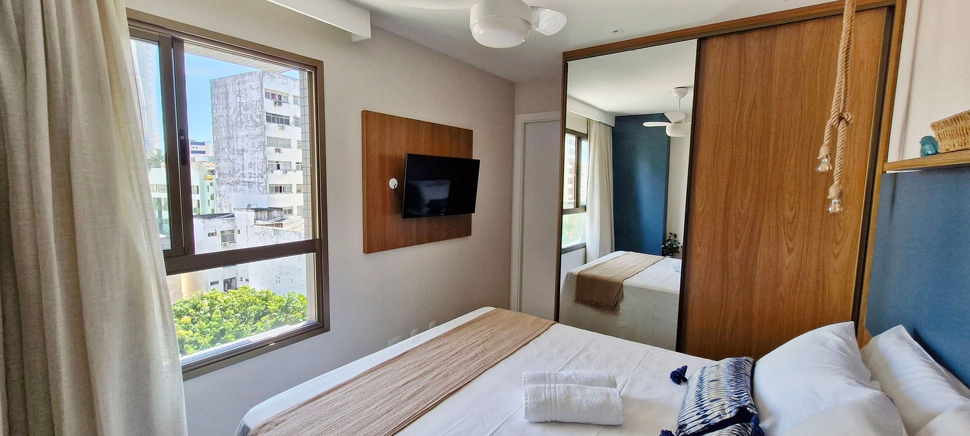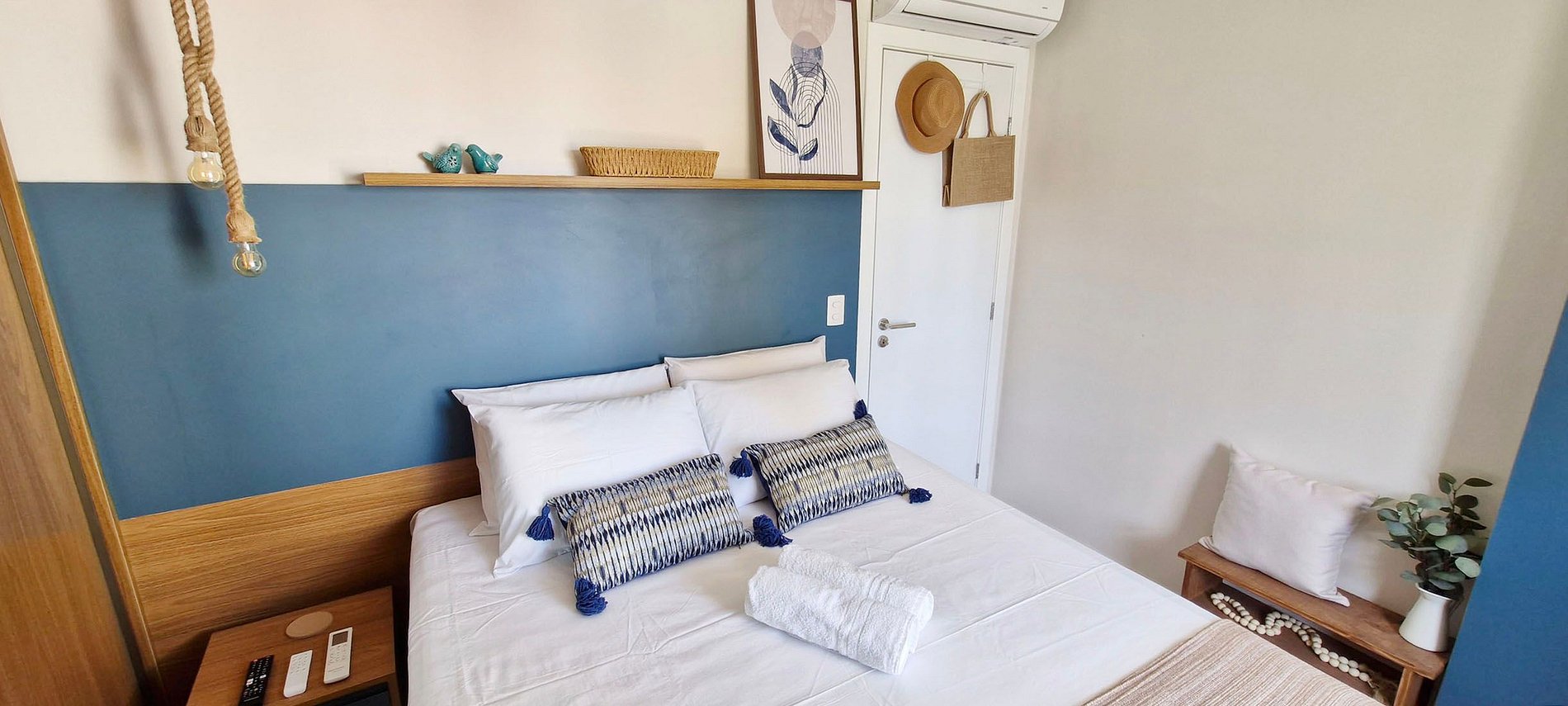 - SUITE: queen bed, lamp, rug, smart TV with apps and local channels, wardrobe with mirror, split air conditioning, ceiling fan with remote control, blackout curtain, bag and straw hat.