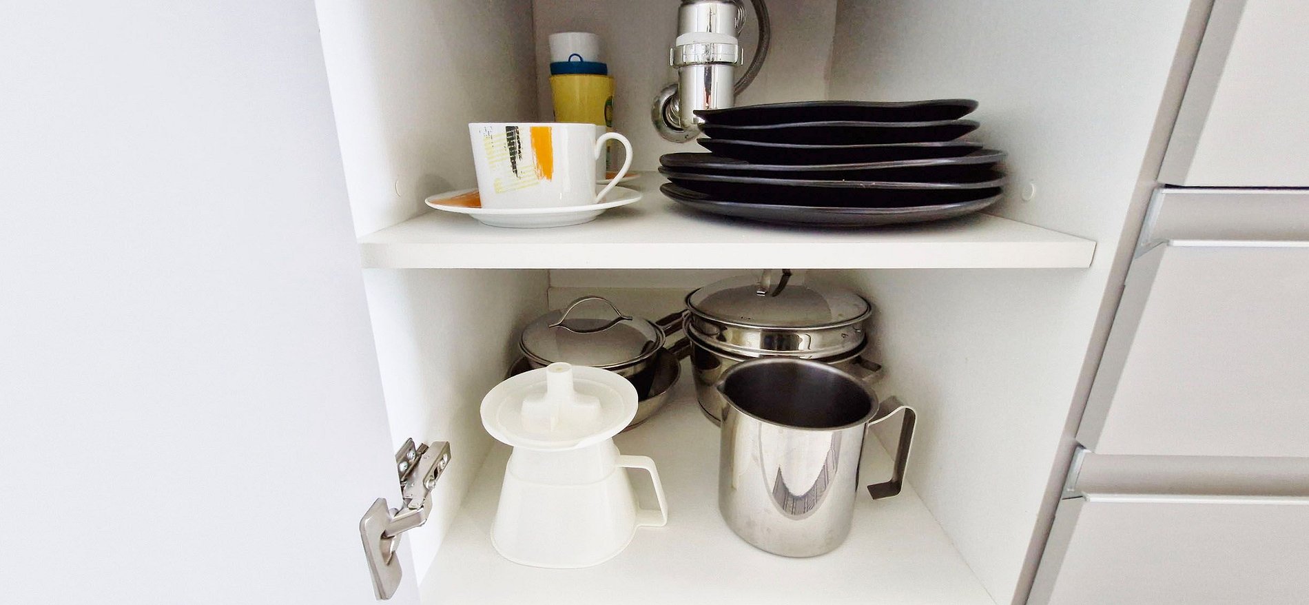- KITCHEN: microwave, sandwich maker, electric coffee maker, mini-fridge, thermos, blender, air fryer, two-burner induction cooktop, range hood, and various kitchen accessories.