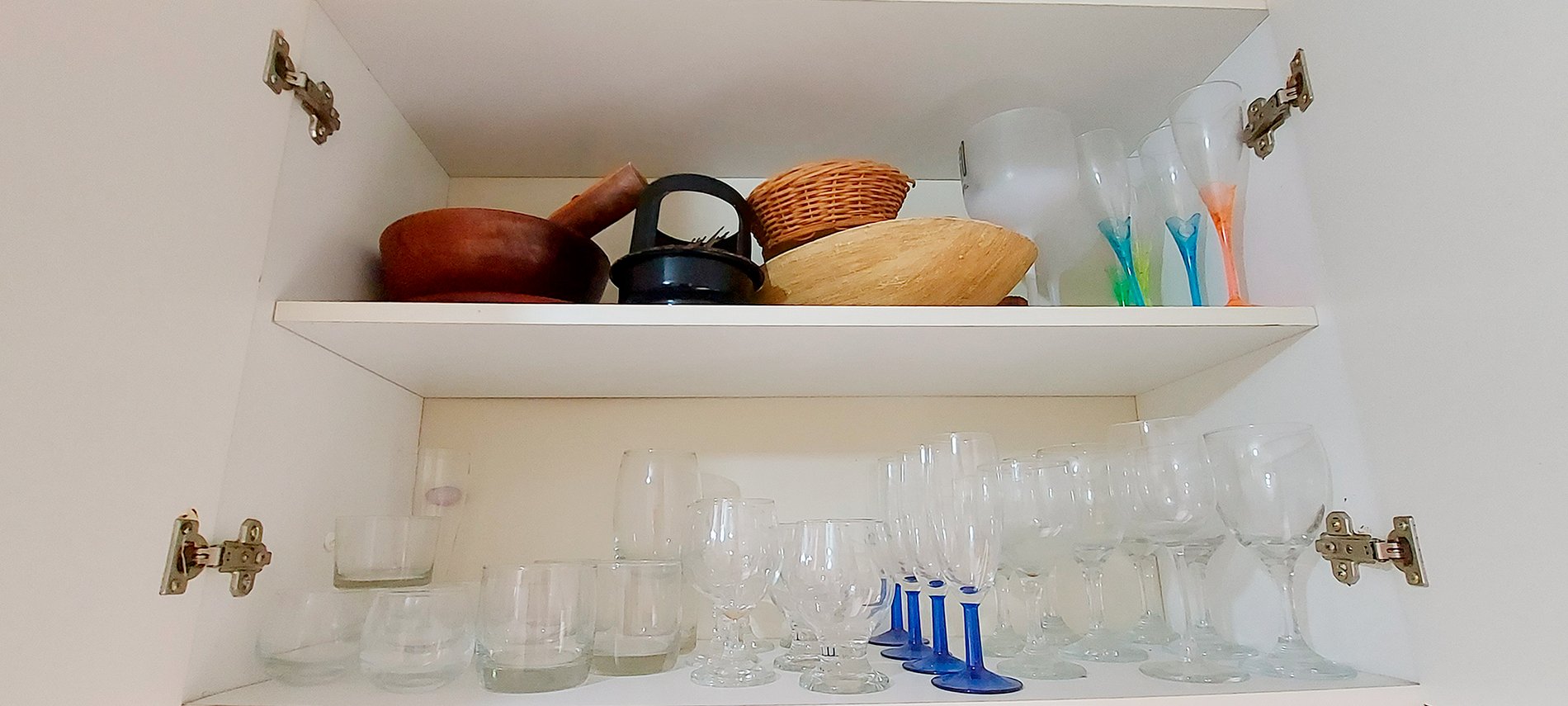 - Complete kitchen with wooden table, 3 chairs, 1 stool, cooler, juicer, 4-burner gas stove, faucet with water filter, sandwich maker, electric coffee maker, refrigerator, blender, 2 thermoses, basic items and accessories of kitchen
