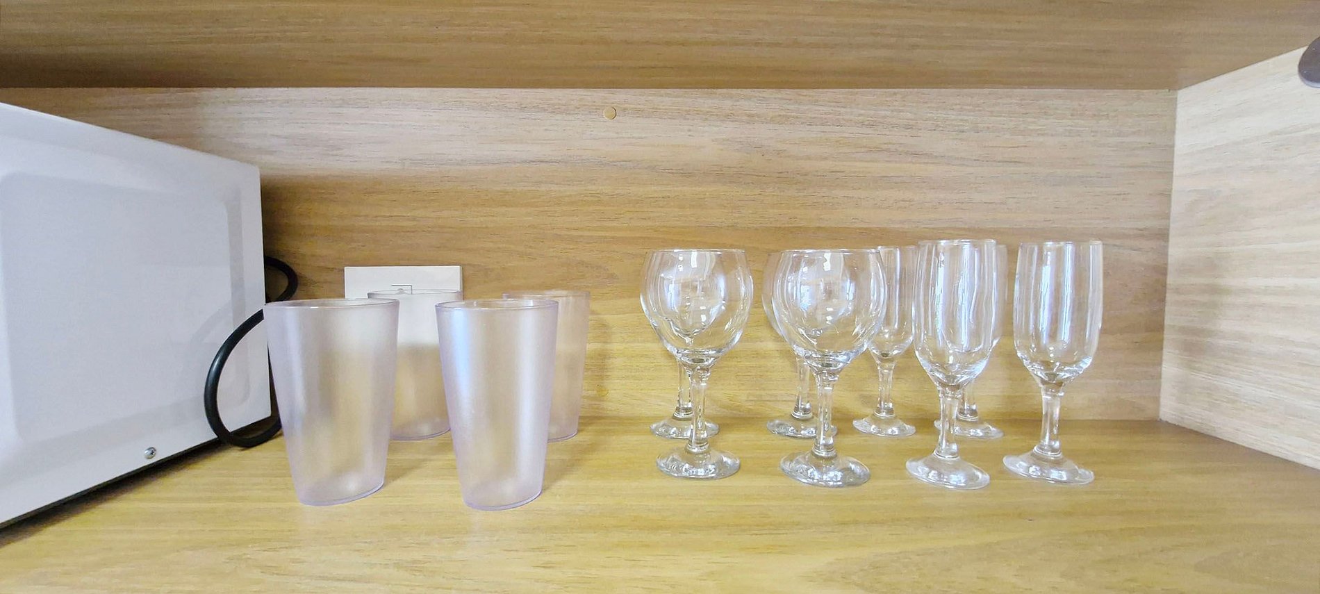 - KITCHEN: American counter with 2 high chairs, intercom, water filter, refrigerator, 2-burner induction cooktop, microwave, blender, sandwich maker, electric coffee maker, glasses, cups, pans and basic kitchen utensils