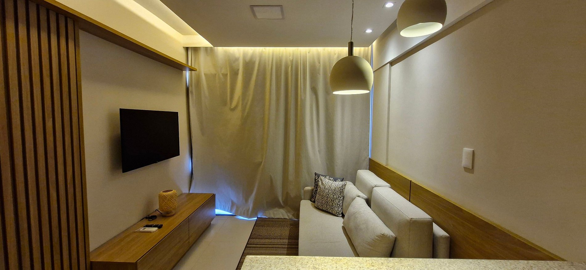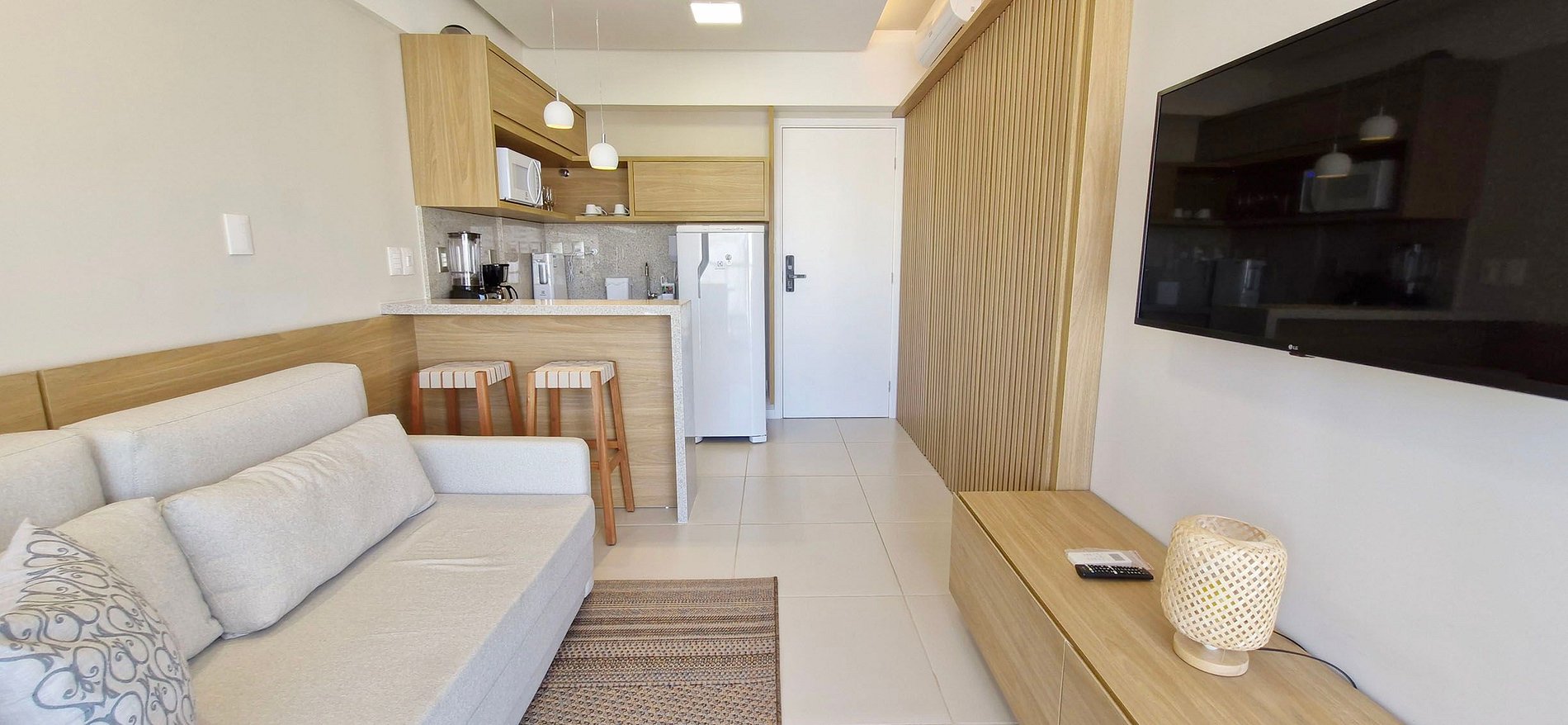 Split air conditioning in the living room and bedroom. Suite with doble bed, large balcony, living room with double sofa bed, smart TV, WI-FI, kitchen. Building with swimming pool and gym on the top floor. Has rotating garage, laundry (you pay directly through the app) and 24h.