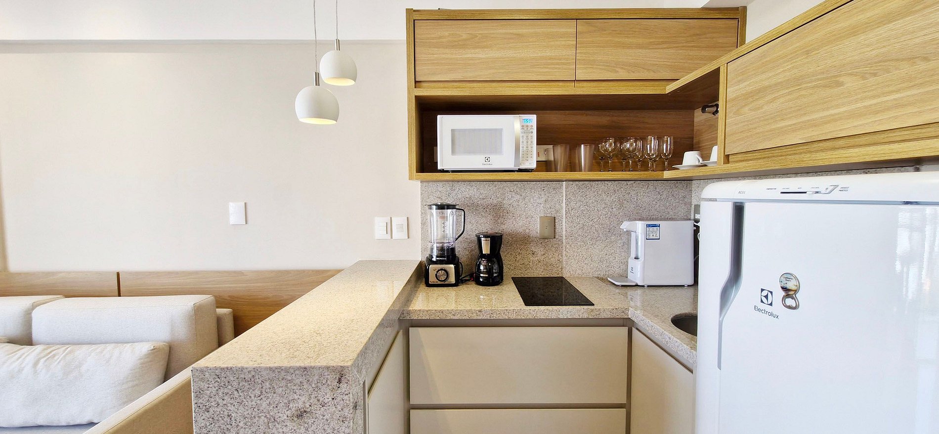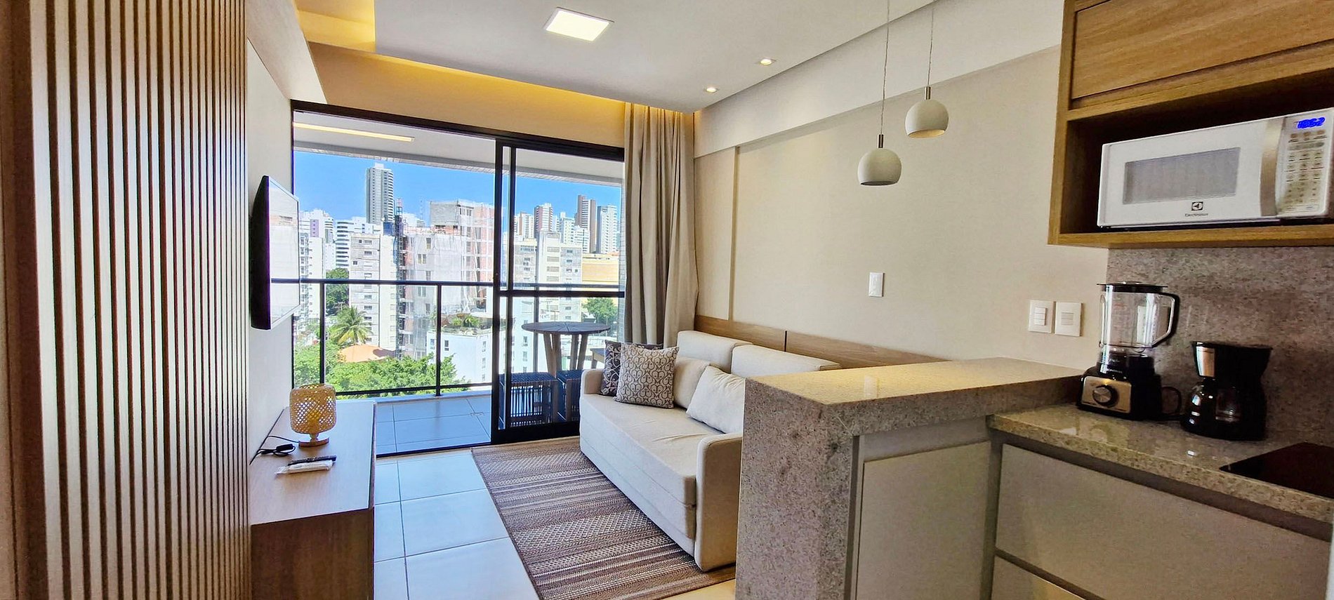 Split air conditioning in the living room and bedroom. Suite with doble bed, large balcony, living room with double sofa bed, smart TV, WI-FI, kitchen. Building with swimming pool and gym on the top floor. Has rotating garage, laundry (you pay directly through the app) and 24h.