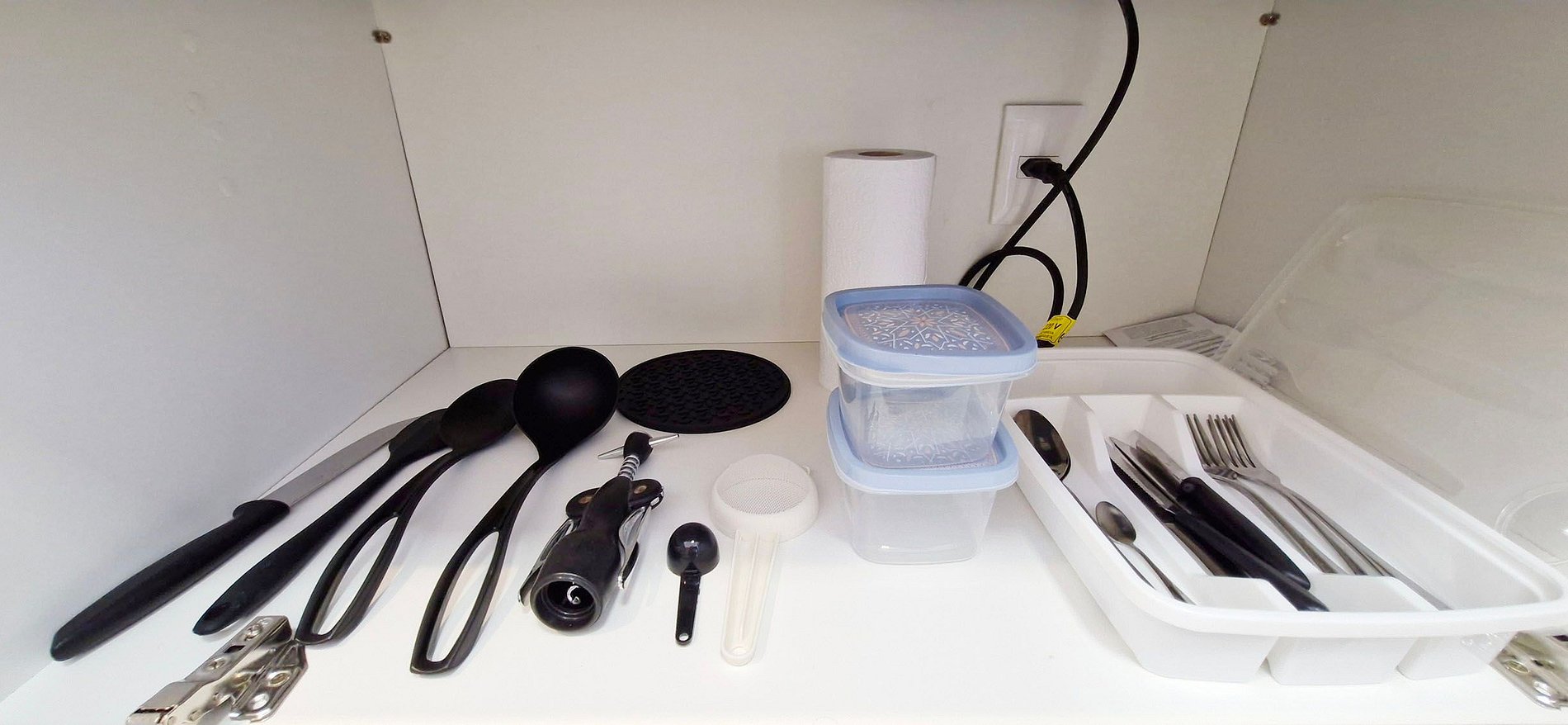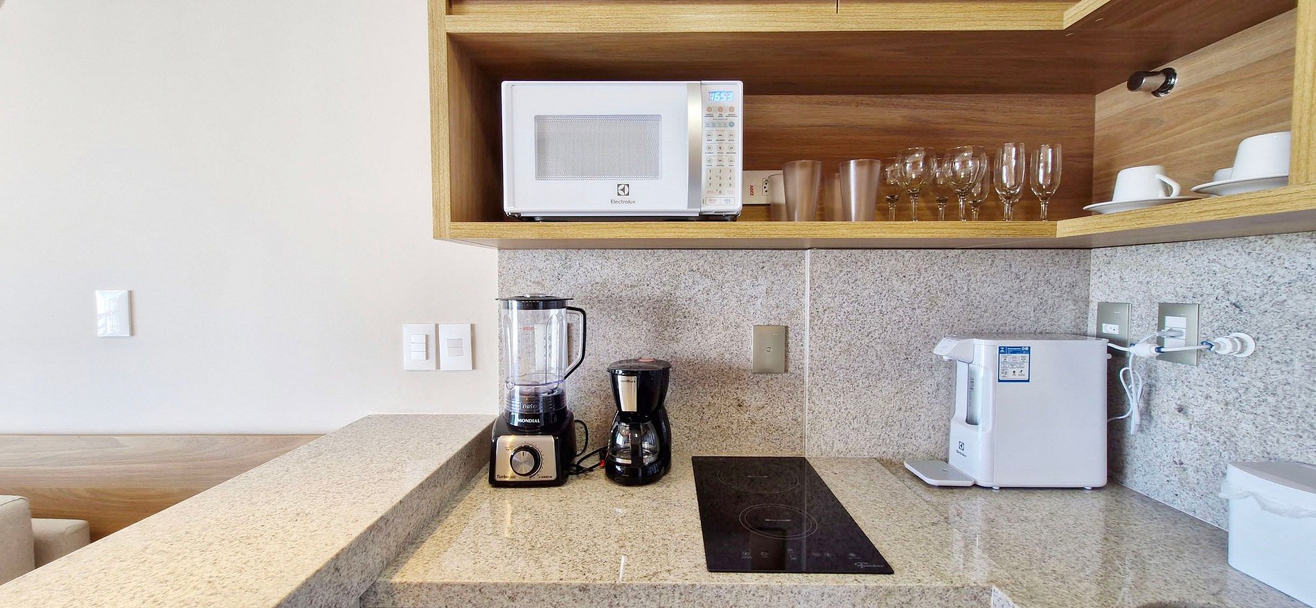 - KITCHEN: American counter with 2 high chairs, intercom, water filter, refrigerator, 2-burner induction cooktop, microwave, blender, sandwich maker, electric coffee maker, glasses, cups, pans and basic kitchen utensils