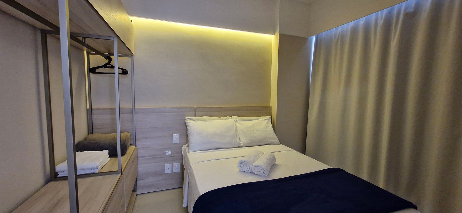 Split air conditioning in the living room and bedroom. Suite with doble bed, large balcony, living room with double sofa bed, smart TV, WI-FI, kitchen. Building with swimming pool and gym on the top floor. Has rotating garage, laundry (you pay directly through the app) and 24h.