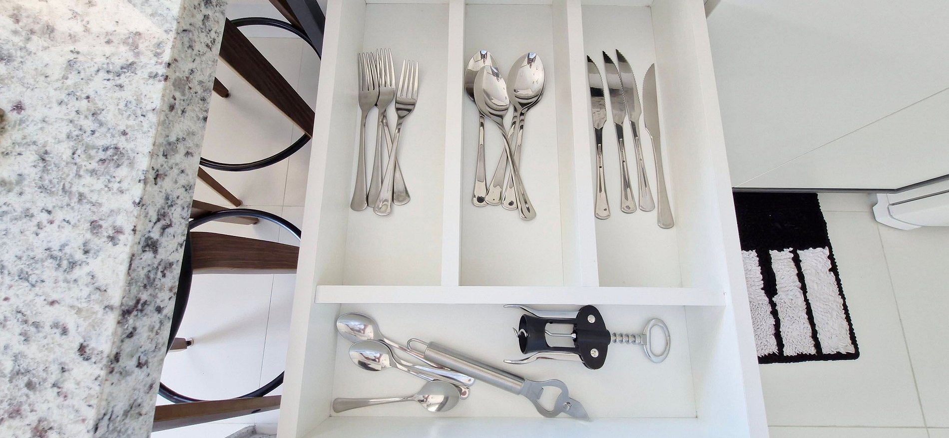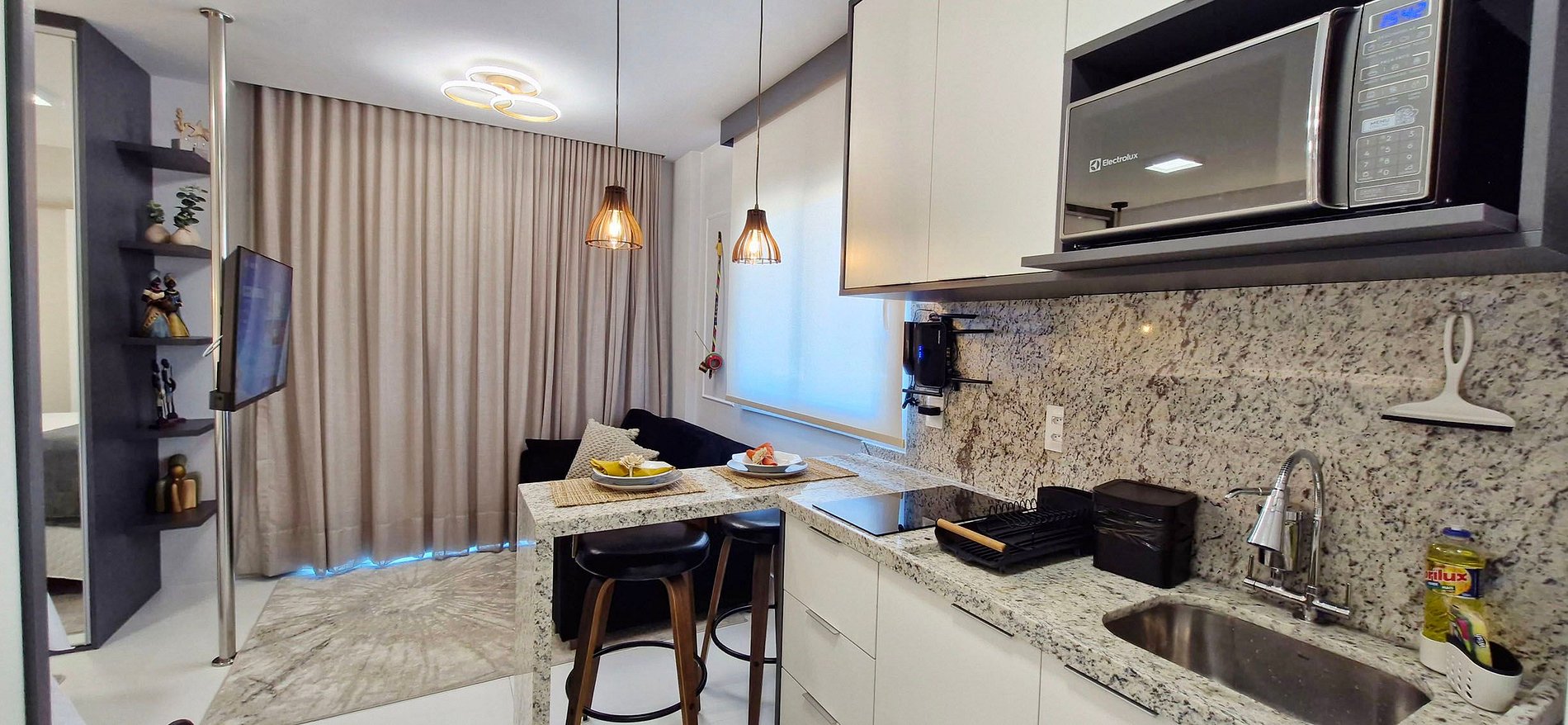 - KITCHEN: duplex refrigerator, sandwich maker, electric coffee maker, thermos, blender, microwave, two-burner induction cooktop, water filter, pans, cutlery, glasses, cups and various kitchen accessories.