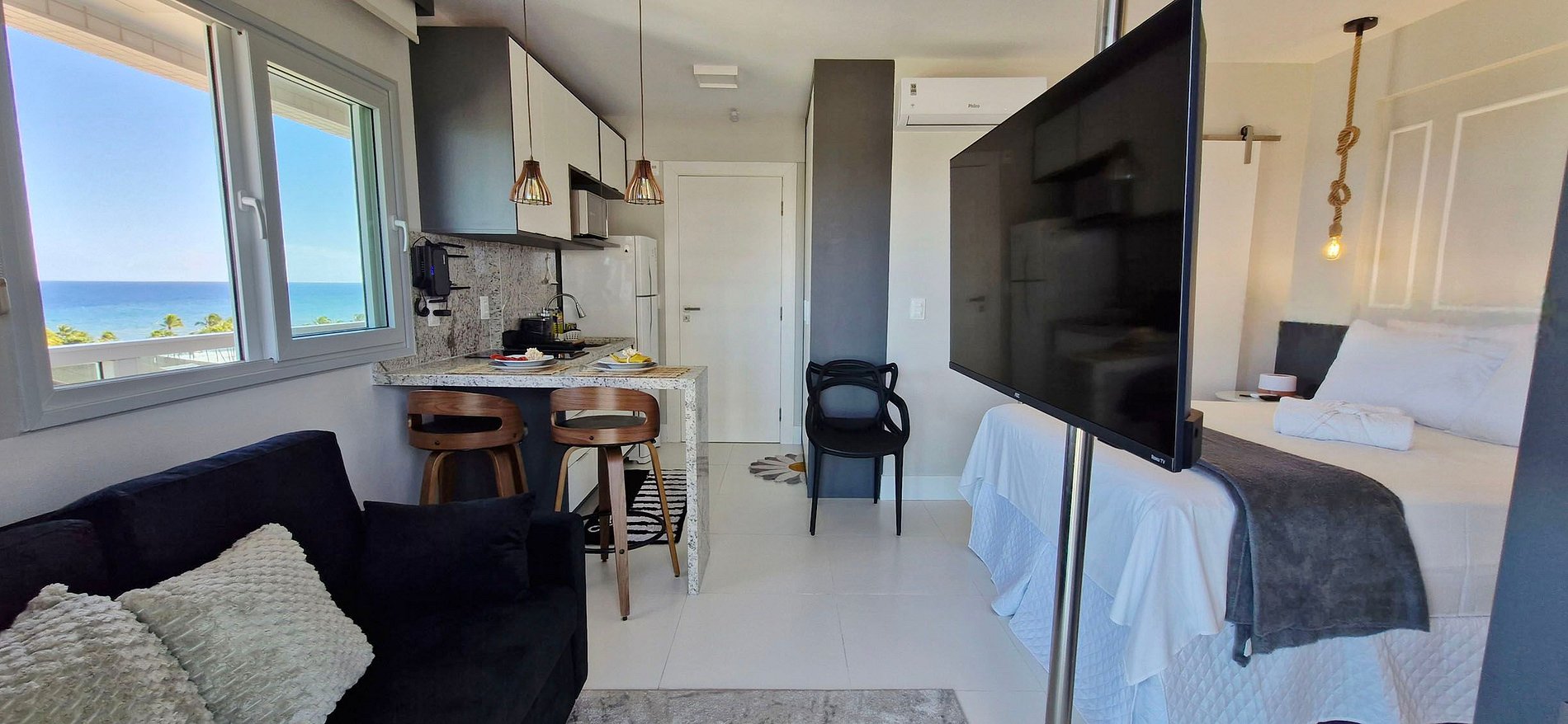 Apartment with a double bed, sofa bed, Smart TV with a swivel arm (you can watch from the bed or sofa), split air conditioning, Wi-Fi, kitchen, bathroom, and a balcony with an ocean view.
