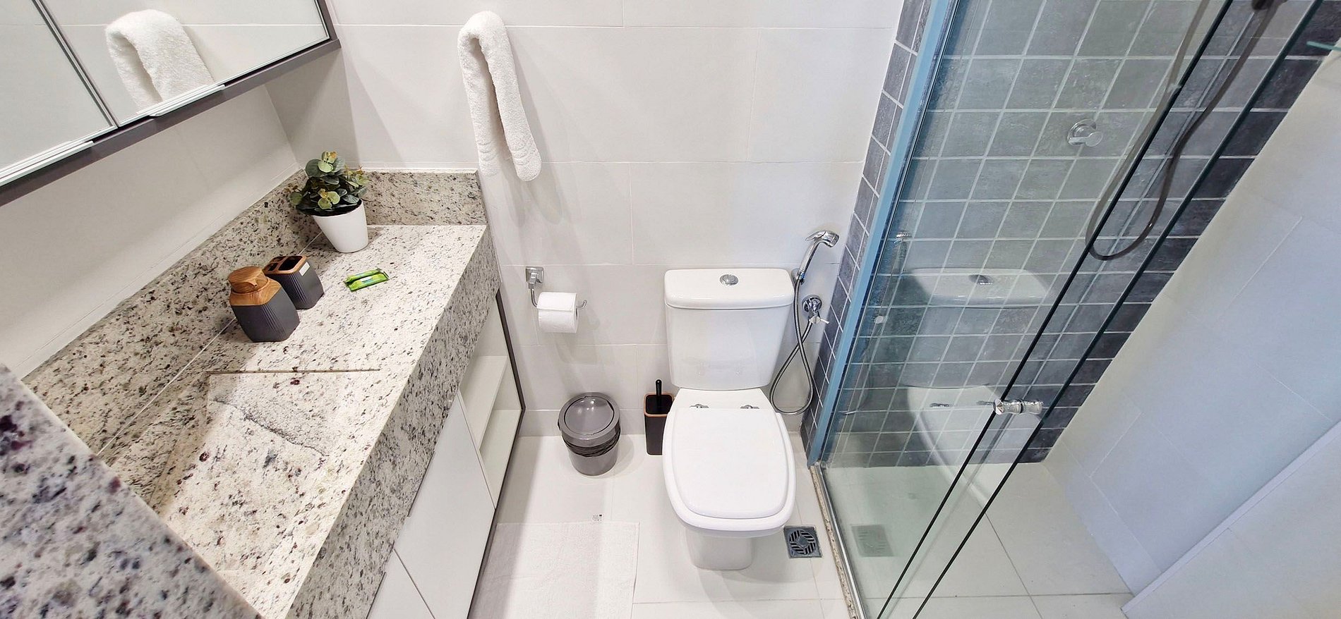 • No solid waste may be flushed down the toilet (including toilet paper). We ask that you use the trash can provided. Otherwise, the toilet may clog and we will charge R$150 to unclog it.
