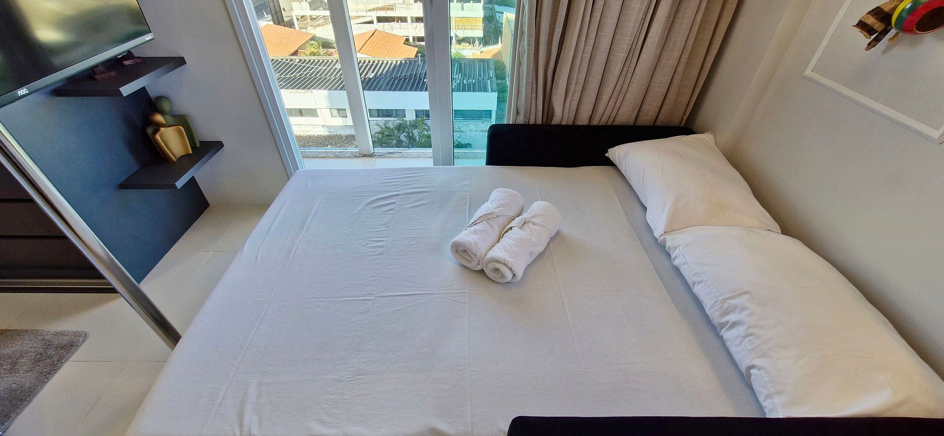 - LIVING ROOM: sofa bed, smart TV (apps and broadcast TV), WI-FI, glass door with blackout curtain