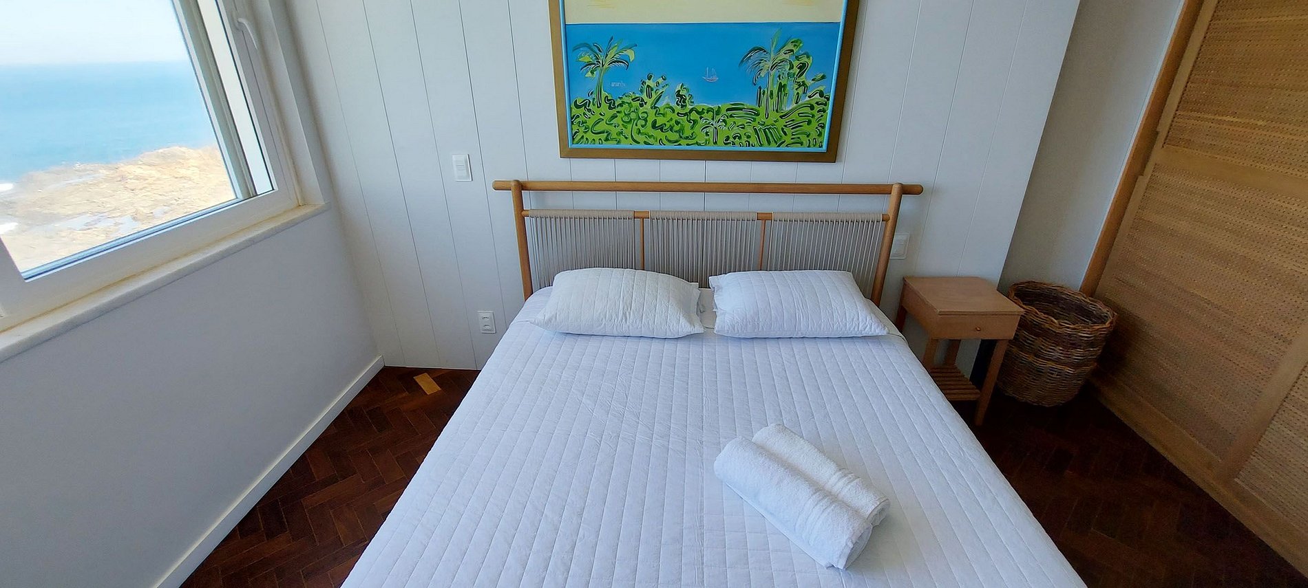 - BEDROOM 1 - SEA VIEW - 1 double bed, 2 single bunk beds, wardrobe, wooden rack, smart TV with local channels, 1 bedside table, 1 wooden table with drawers, blackout curtain, split air conditioning