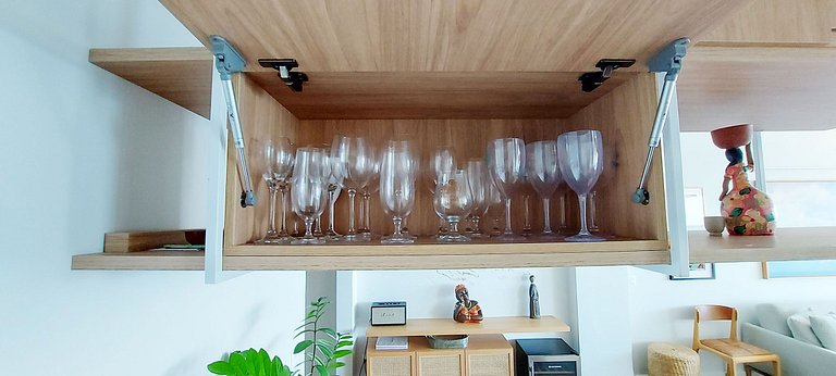 - Open kitchen with L-shaped countertop, 5-burner gas cooktop, electric oven, microwave, 3-door French door refrigerator, counter with sink, cabinet, built-in dish drainer, dishwasher, water filter, thermos, blender , Nexpresso coffee maker, bowls, glasses, plates, cups, pans, pots and other kitchen accessories, 1 split air conditioner