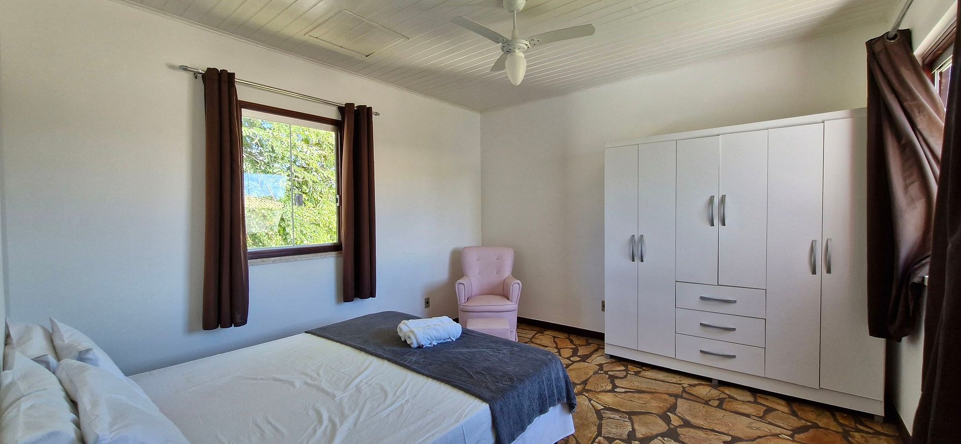 - LIVING ROOM with closet, pouf, makeup table, thin curtain. SUITE with double bed, bedside table with lamp and split air conditioning. BATHROOM with toilet, sink, mirror, shower enclosure and electric shower.