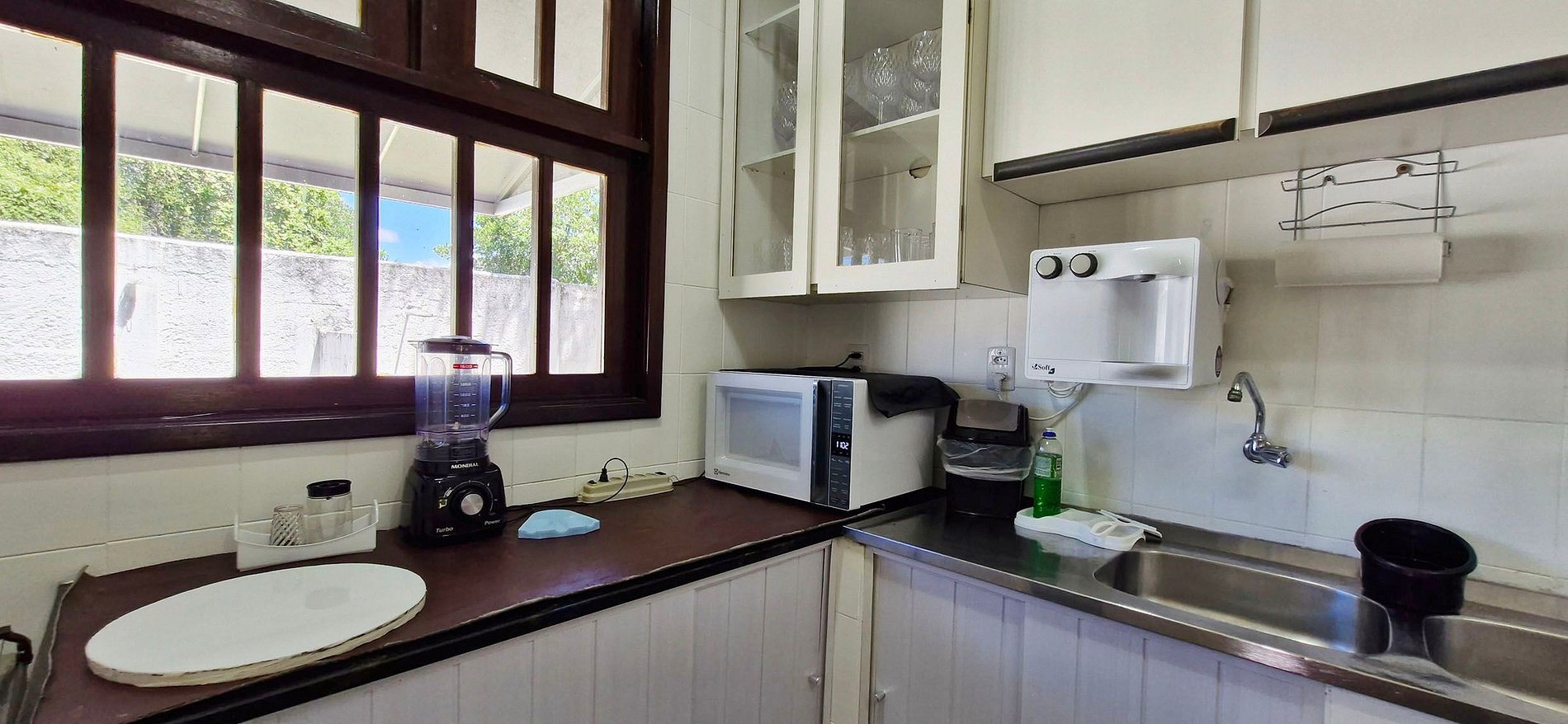 - Double-door refrigerator, gas stove, microwave, water filter, electric coffee maker, thermos, sandwich maker, blender, glasses, cups, pans, cutlery, plates and basic kitchen items