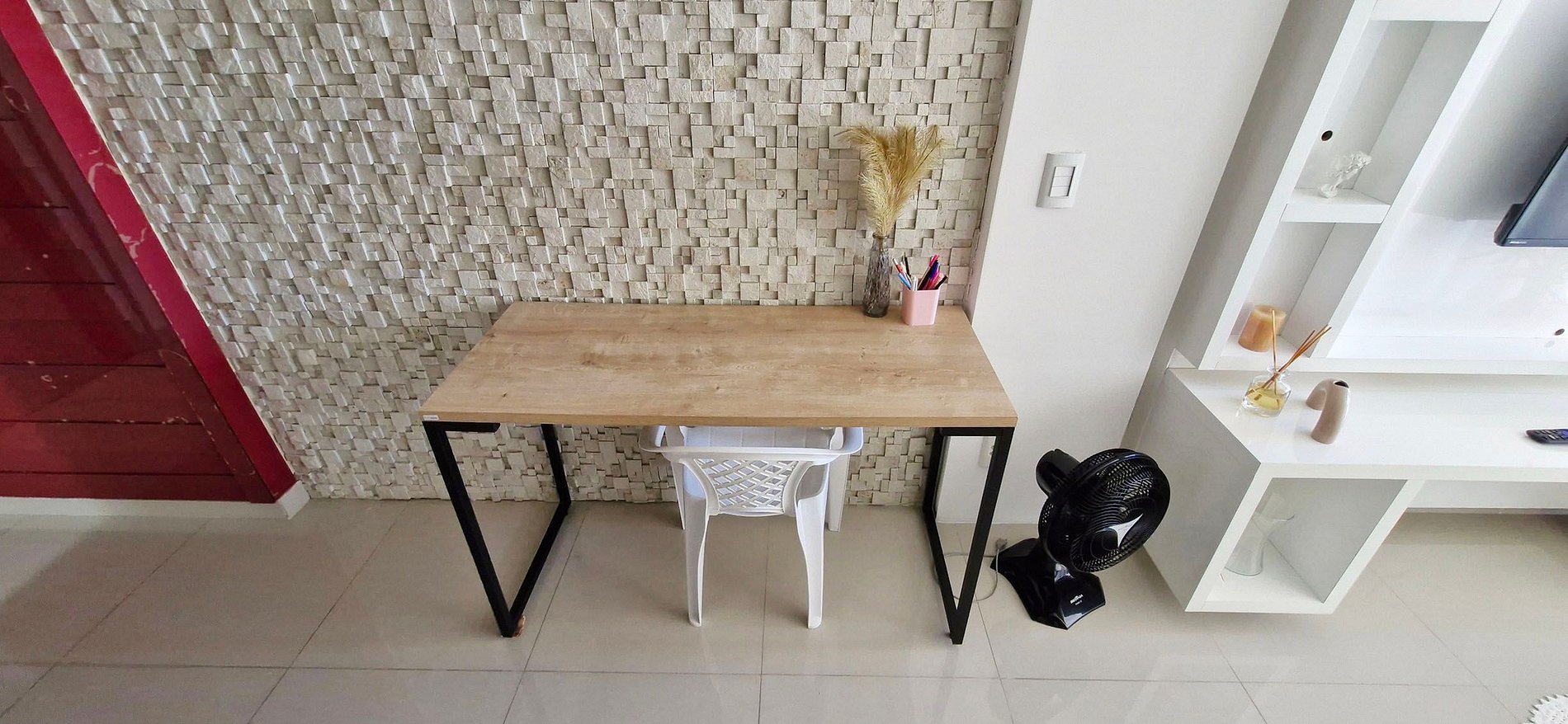 - 2-seater sofa with 2 pillows, rack with smart TV (apps and local channels), desk with chair, table fan, power strip, curtain, decorative objects