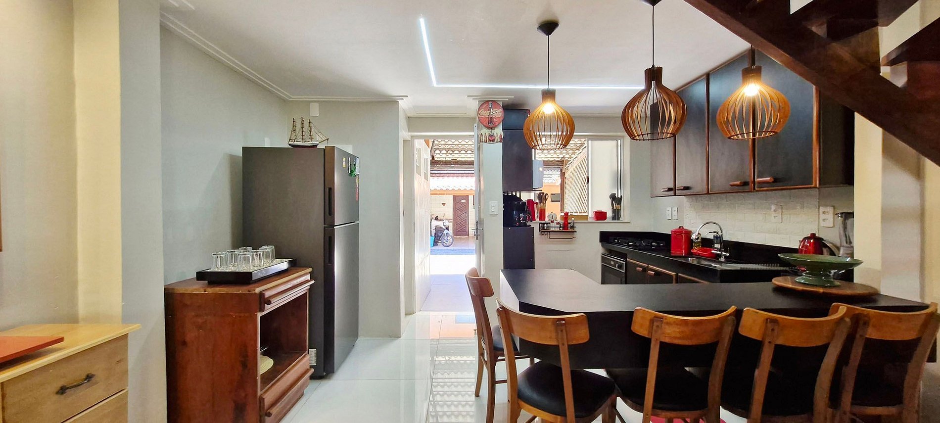 - KITCHEN with counter and 5 chairs, duplex refrigerator, cabinets, gas cooktop, oven, electric toaster, blender, kettle, airfryer, microwave, sandwich maker, electric coffee maker, water filter, mixer, couscous maker, pressure cooker and basic kitchen items