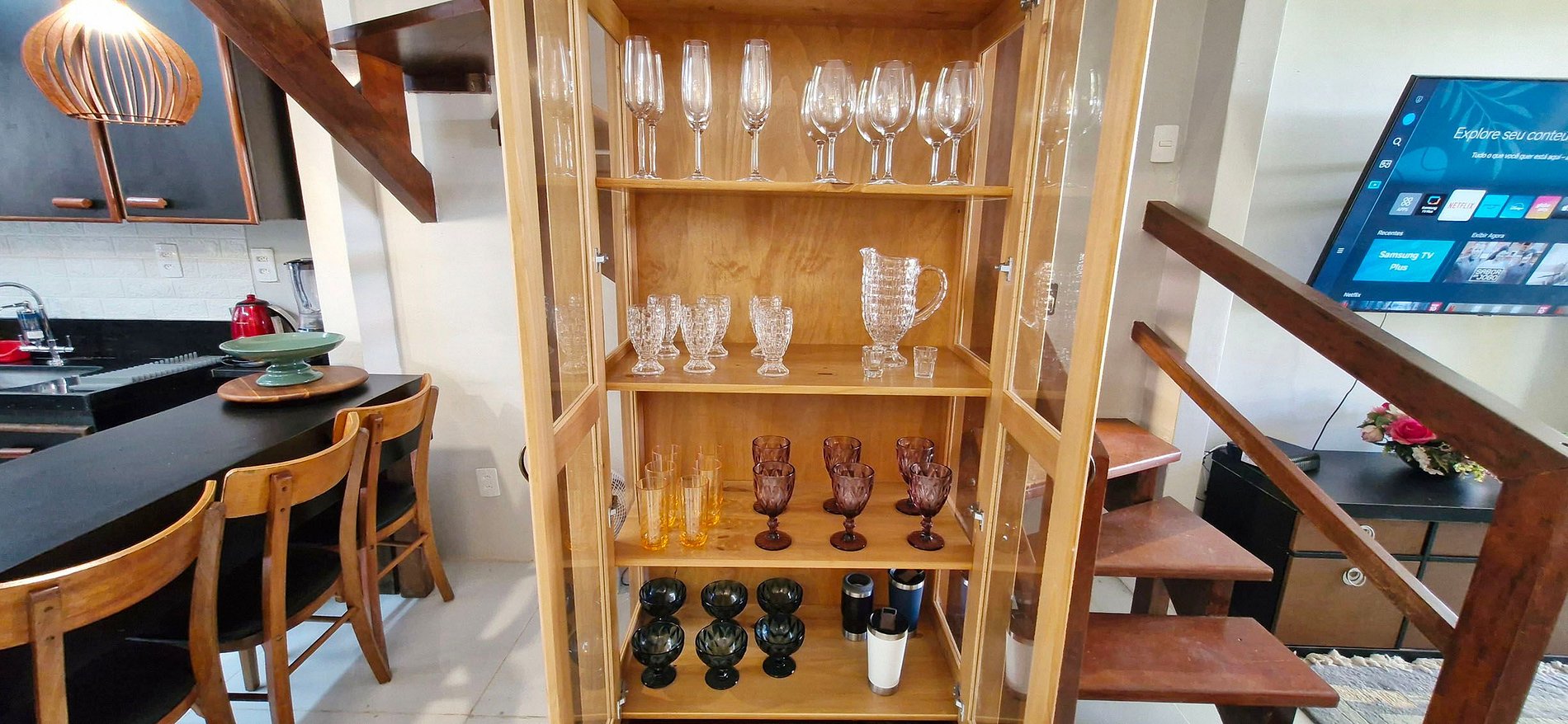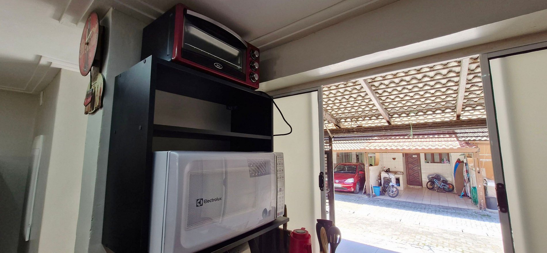 - KITCHEN with counter and 5 chairs, duplex refrigerator, cabinets, gas cooktop, oven, electric toaster, blender, kettle, airfryer, microwave, sandwich maker, electric coffee maker, water filter, mixer, couscous maker, pressure cooker and basic kitchen items