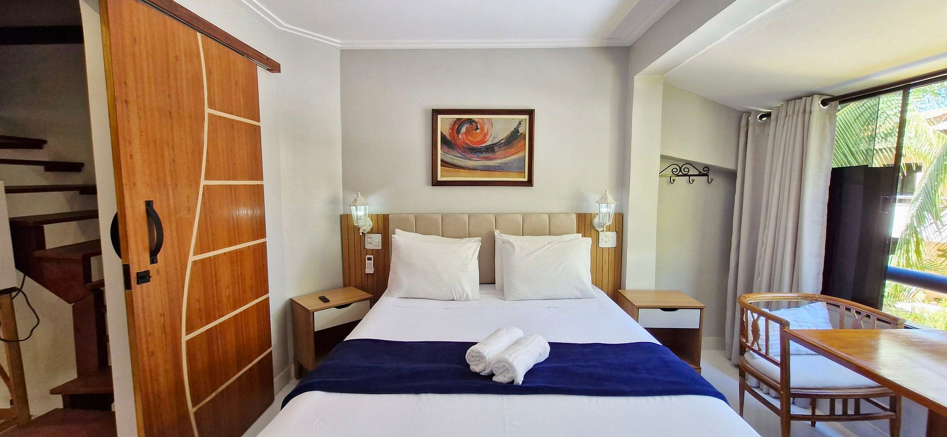 - SUITE (3 people): 1 single bunk bed with extra bed, 1 single bed, 2 chairs, wardrobe, split air conditioning, ceiling fan, smart TV (apps and local channels), iron, blackout curtain. BATHROOM with sink, mirror, bidet, shower and electric shower