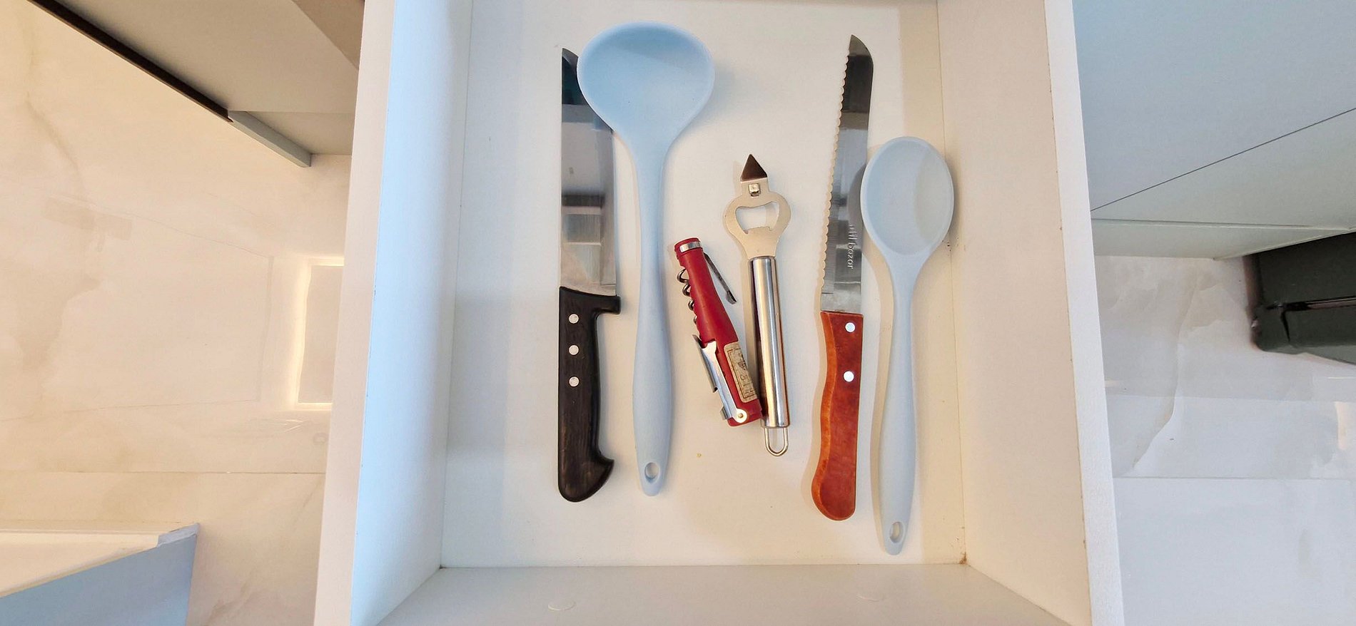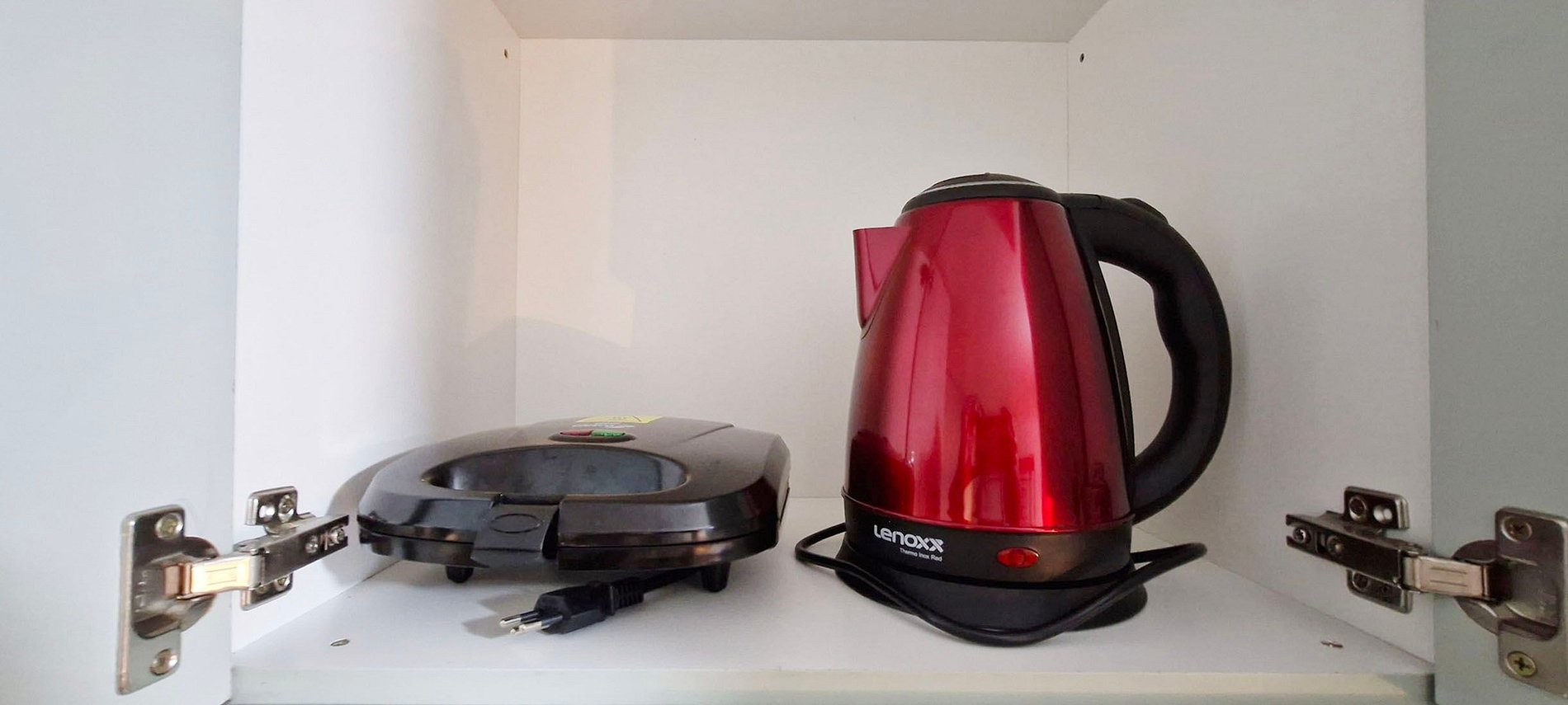 - KITCHEN: counter with 2 high stools, duplex refrigerator, sandwich maker, thermos, blender, microwave, two-burner induction cooktop, water filter, pots, cutlery, glasses and various kitchen accessories.