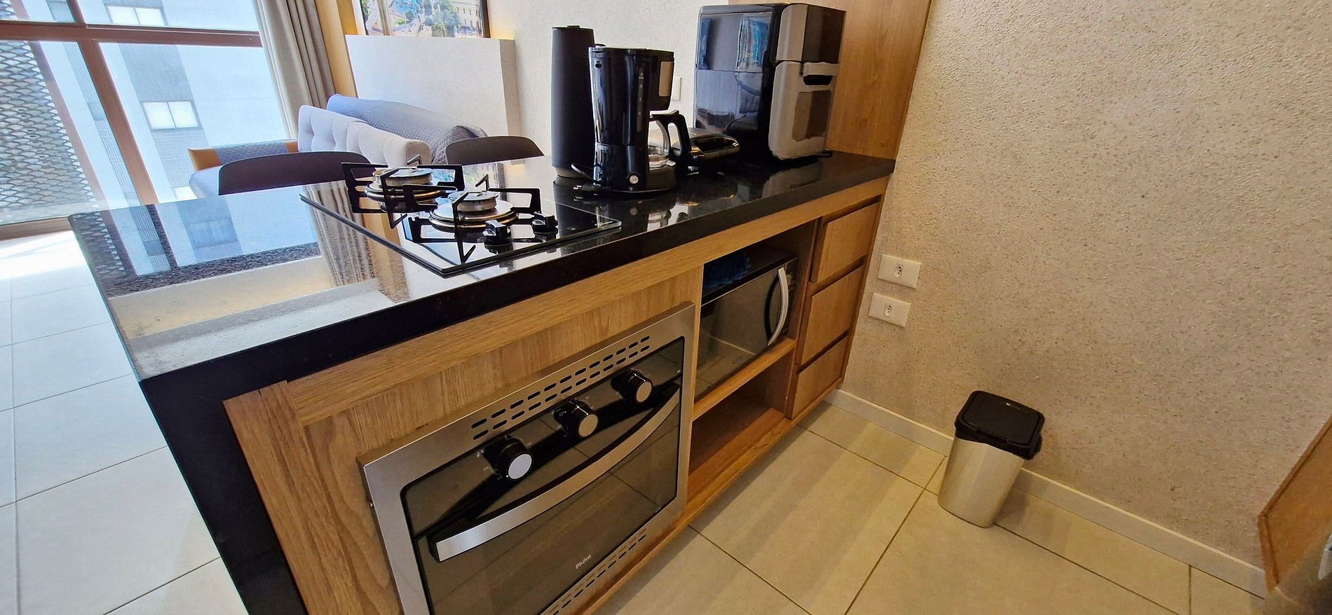 - KITCHEN: duplex refrigerator, sandwich maker, airfryer, electric coffee maker, thermos, blender, microwave, two-burner cooktop, air purifier, electric oven, water filter, pans, cutlery, glasses, cups and various kitchen accessories.