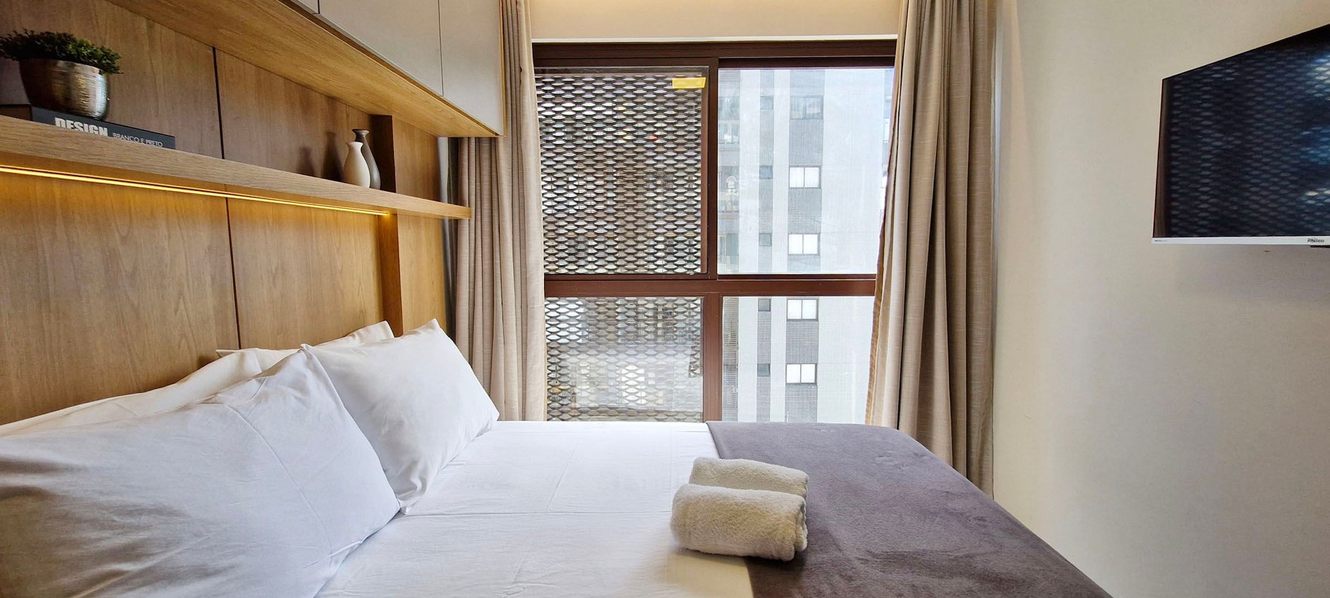 - SUITE: double bed, wardrobe, smart TV (apps and broadcast TV), split air conditioning, window with blackout curtain, LED light. BATHROOM: closet, mirror, shower, electric shower, straightener and hair dryer.