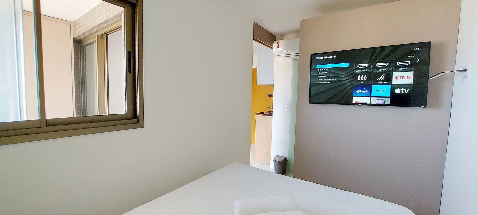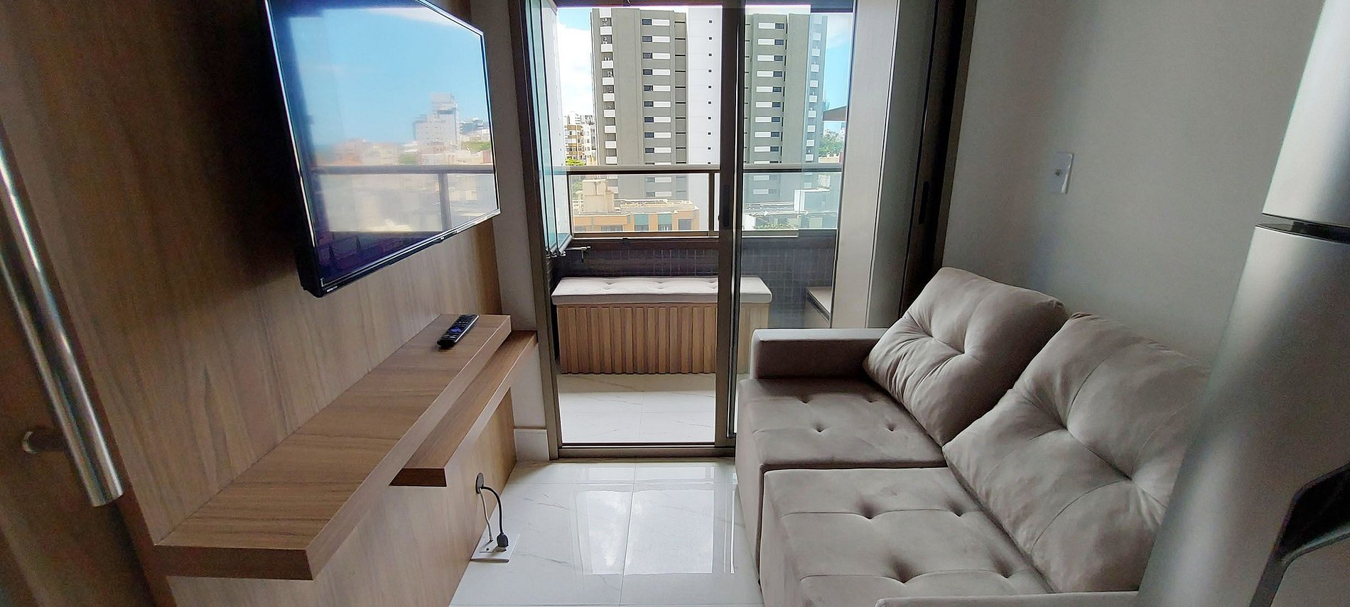 Beautiful apartment, 24m², with sea view, well decorated, in Costa Azul! Property with double bed, split air conditioning, sofa, smart TV in the living room and bedroom and full kitchen. The building has 24-hour doorman, gym, swimming pool, co-working space, 1 parking space (rotating).