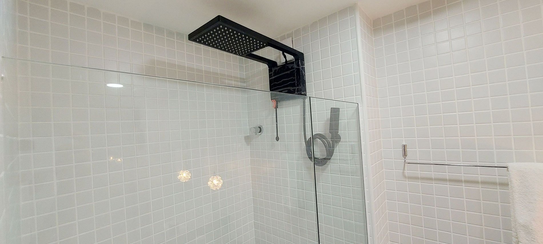 - Bathroom with electric shower, glass shower enclosure, sink with mirror and closet