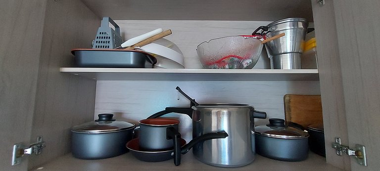 - Full kitchen with water filter, blender, electric coffee maker, sandwich maker, 4-burner stove, duplex refrigerator, microwave