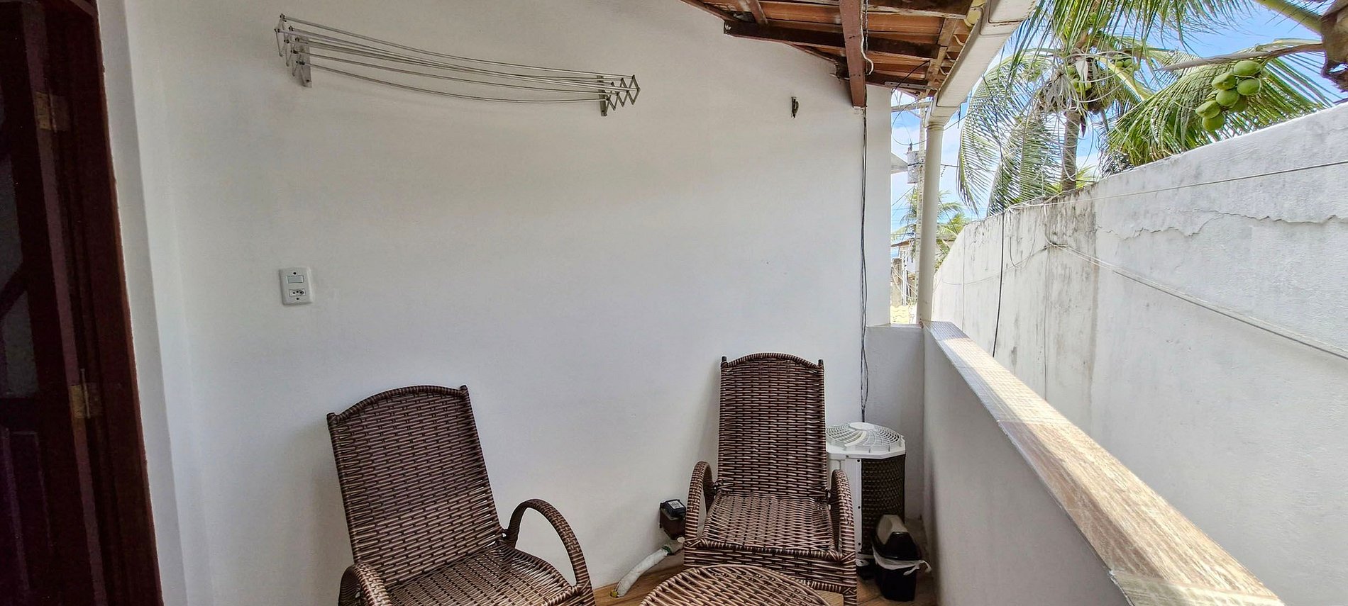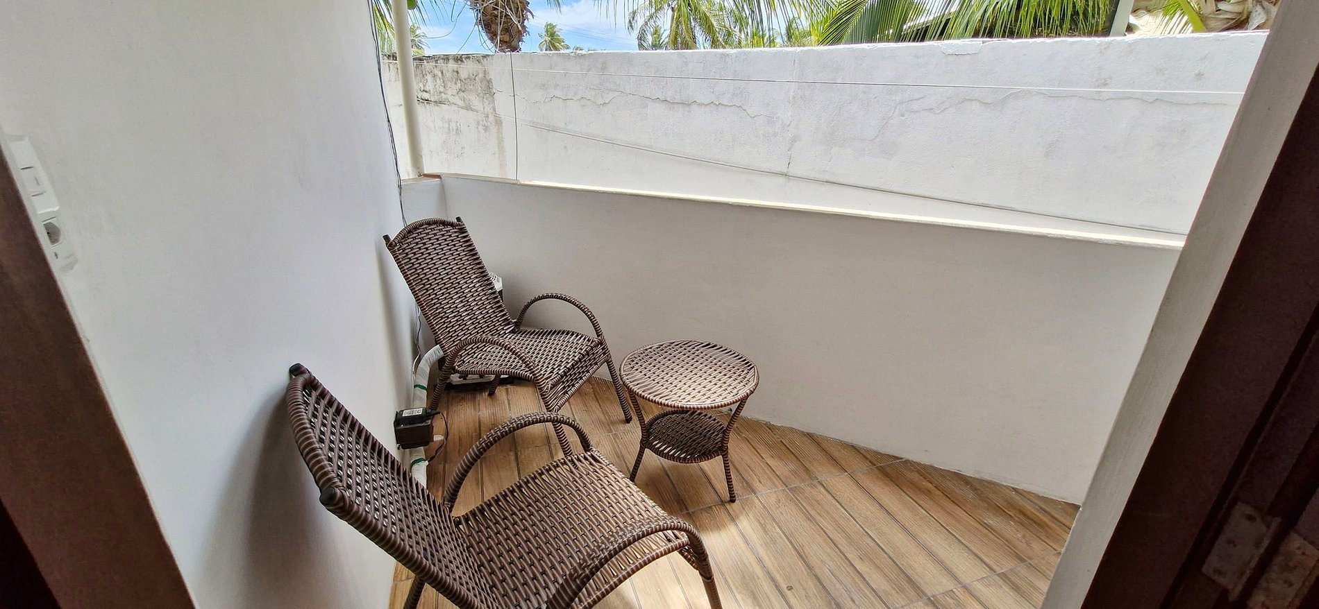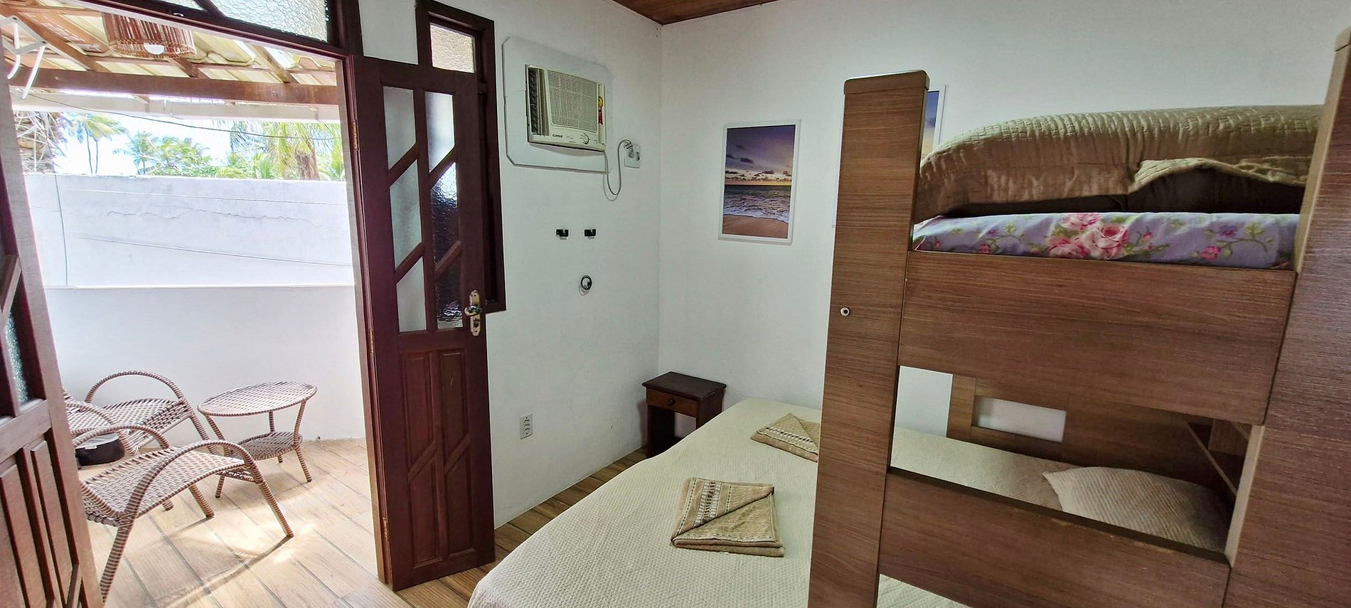 ROOM 3 (with balcony): Bunk bed (double bed + single bed), window air conditioning, curtain, balcony with table, 2 wicker chairs and wall-mounted clothesline