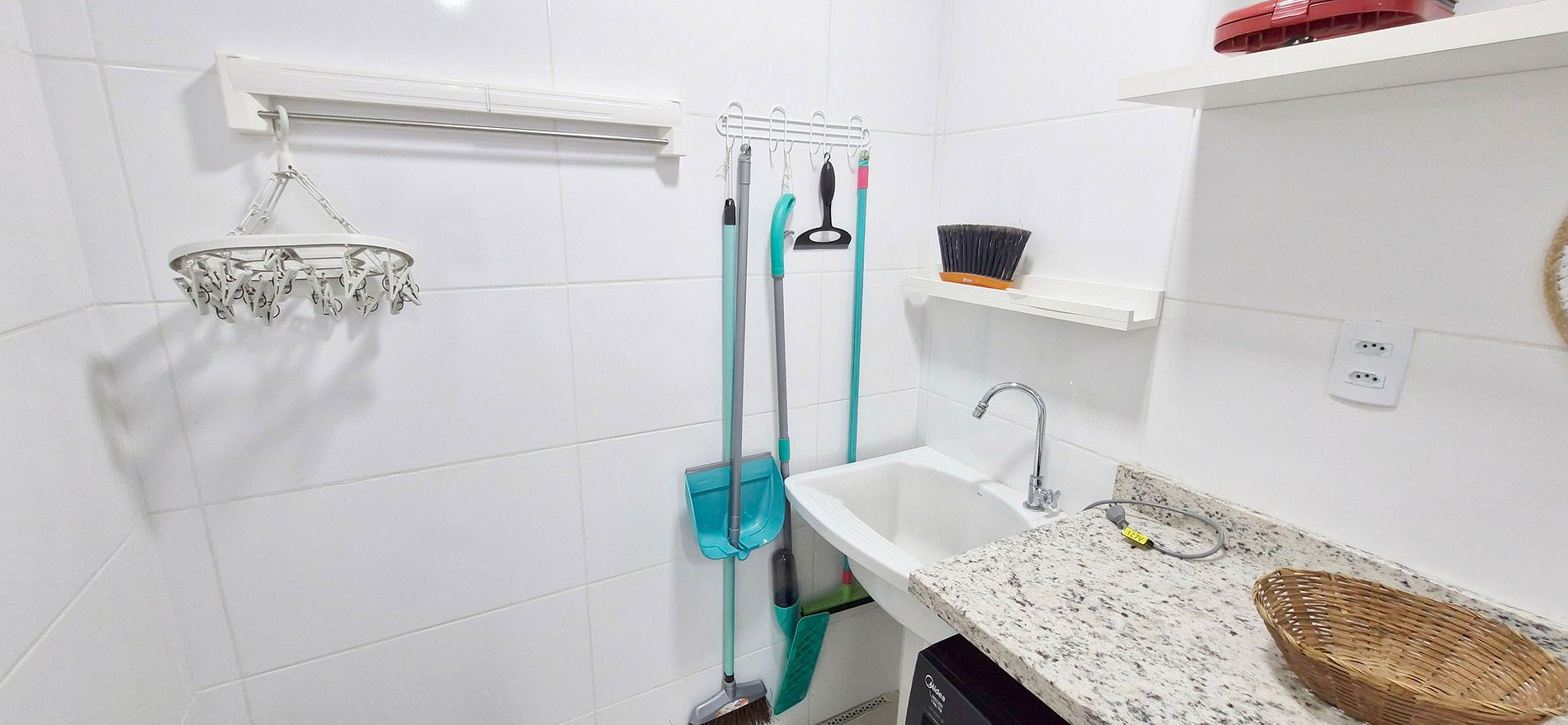 - Laundry area with sink, washing machine, iron, ironing board, clothesline, broom, mop, and dustpan