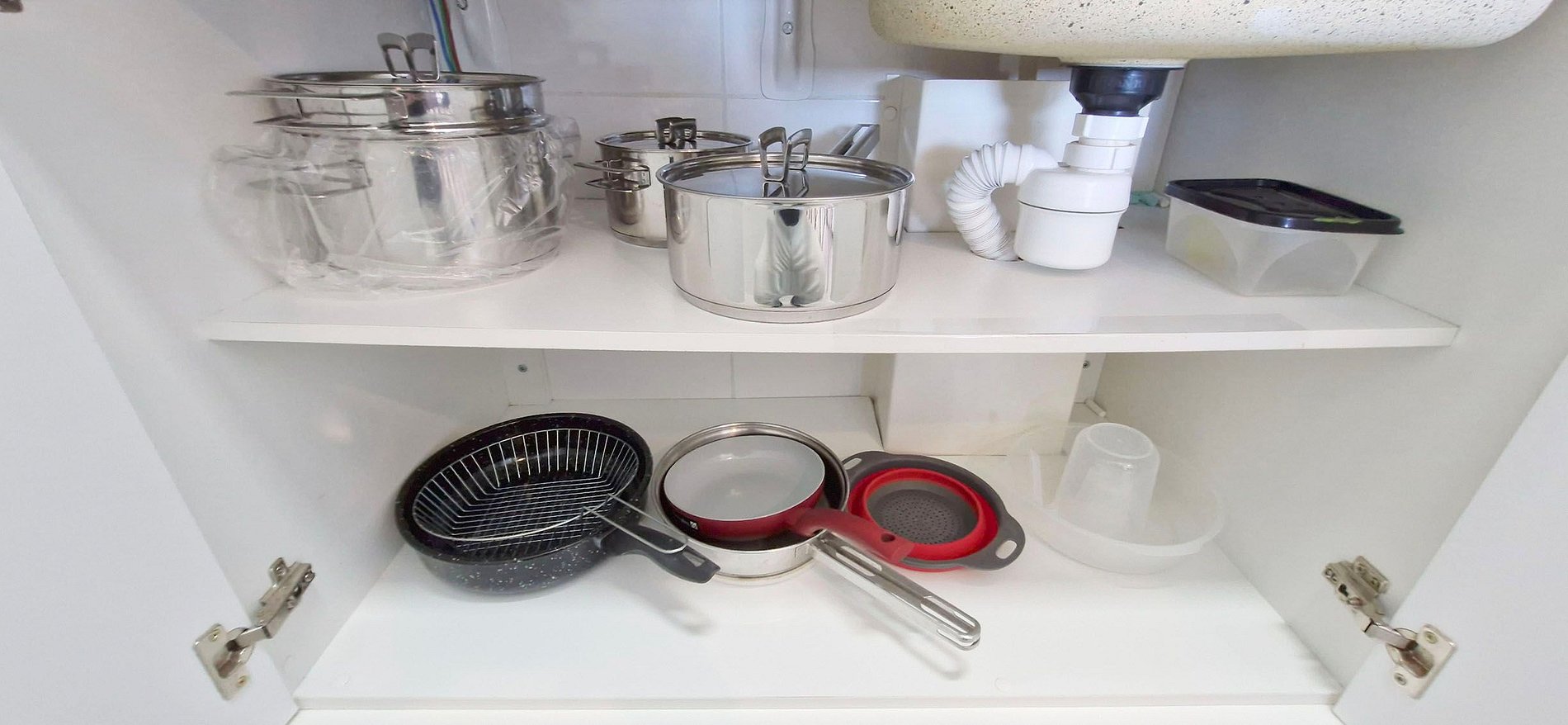 - Kitchen with induction cooktop, electric oven, double-door refrigerator, microwave, blender, sandwich maker, electric coffee maker, water filter, glasses, cups, pots, and kitchen accessories.