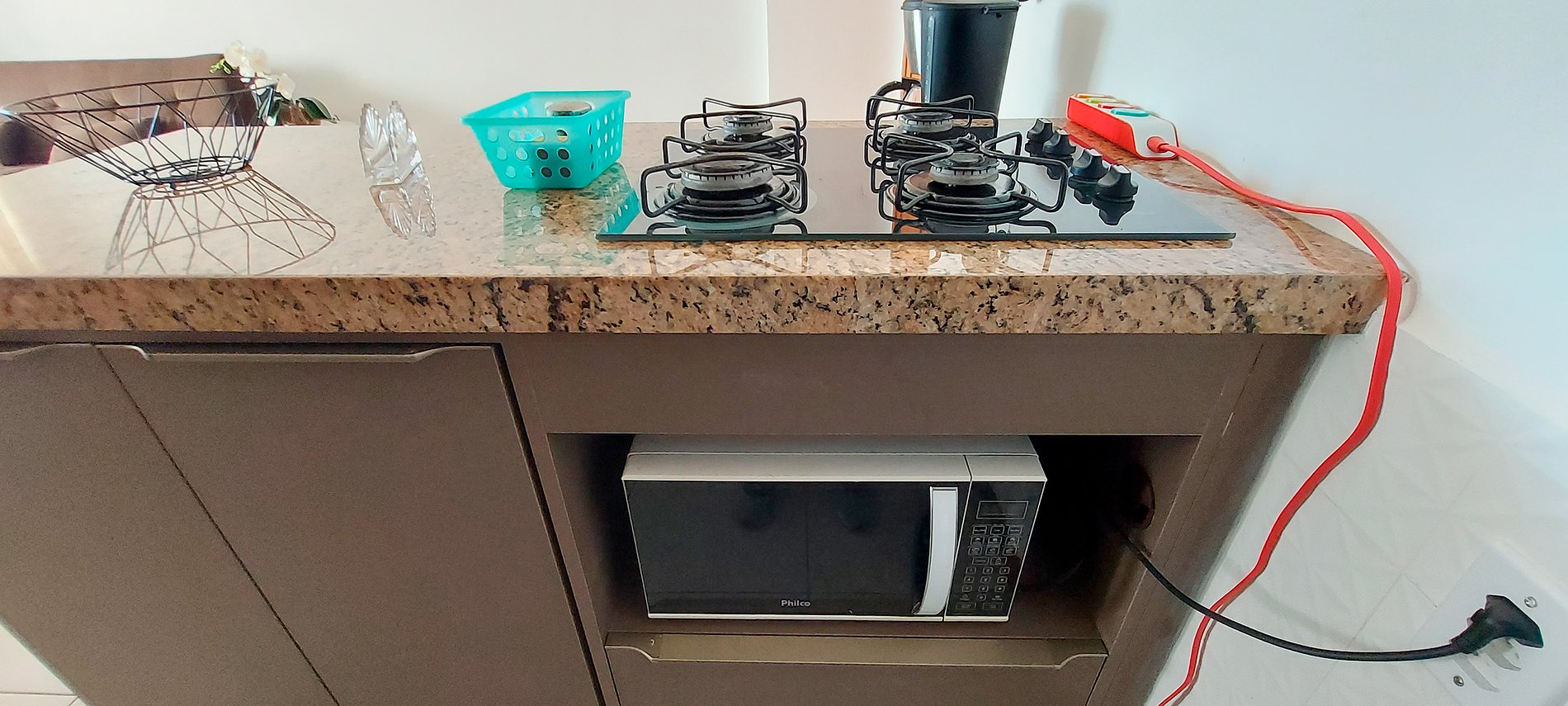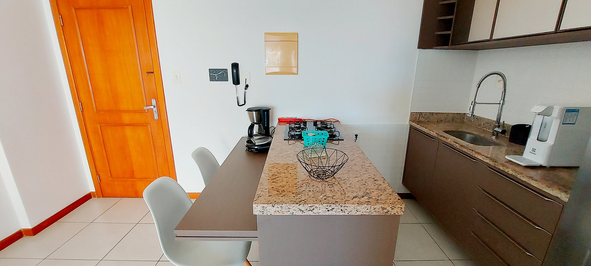 - Kitchen with counter and two chairs, duplex refrigerator, 4-burner cooktop, water filter, microwave, blender, coffee maker, sandwich maker