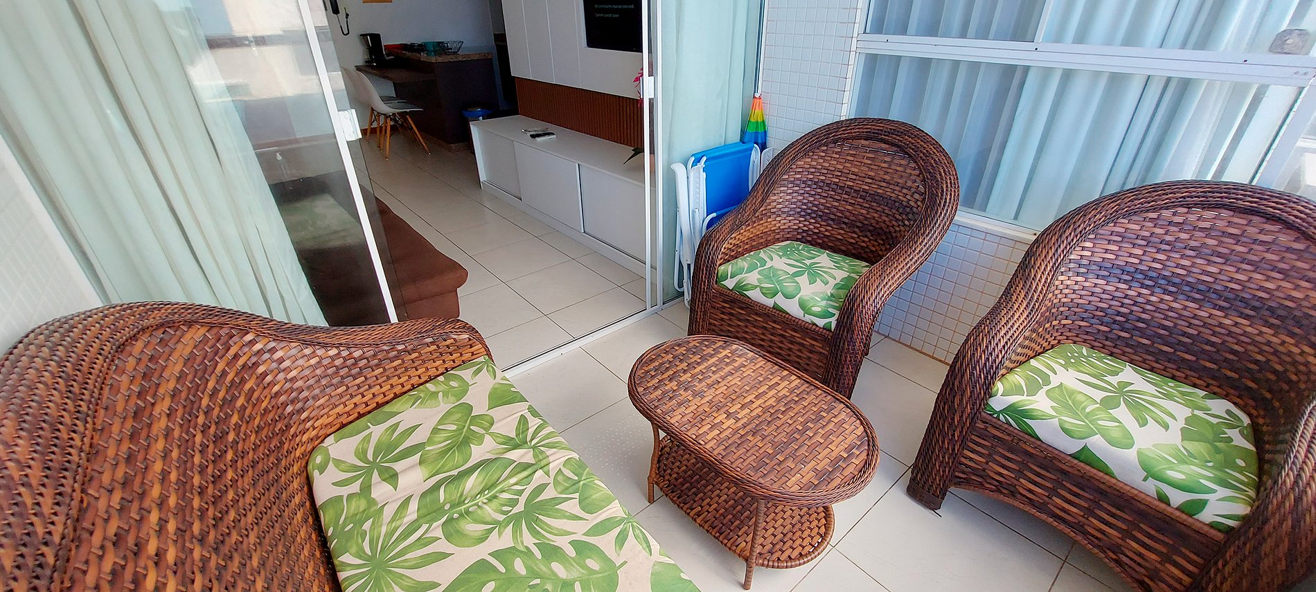 - Balcony with table, two chairs and a 2-seater wicker sofa, 2 beach chairs and 1 umbrella