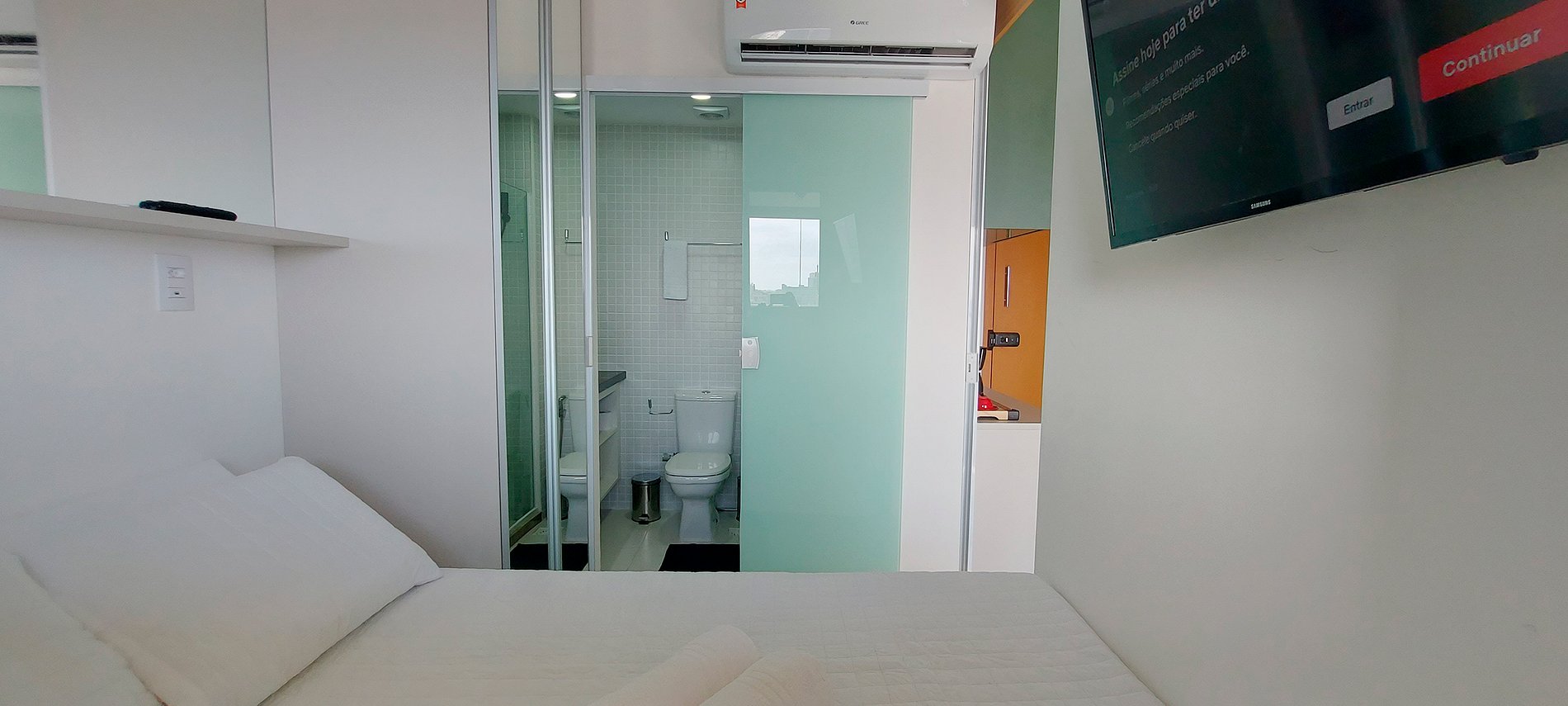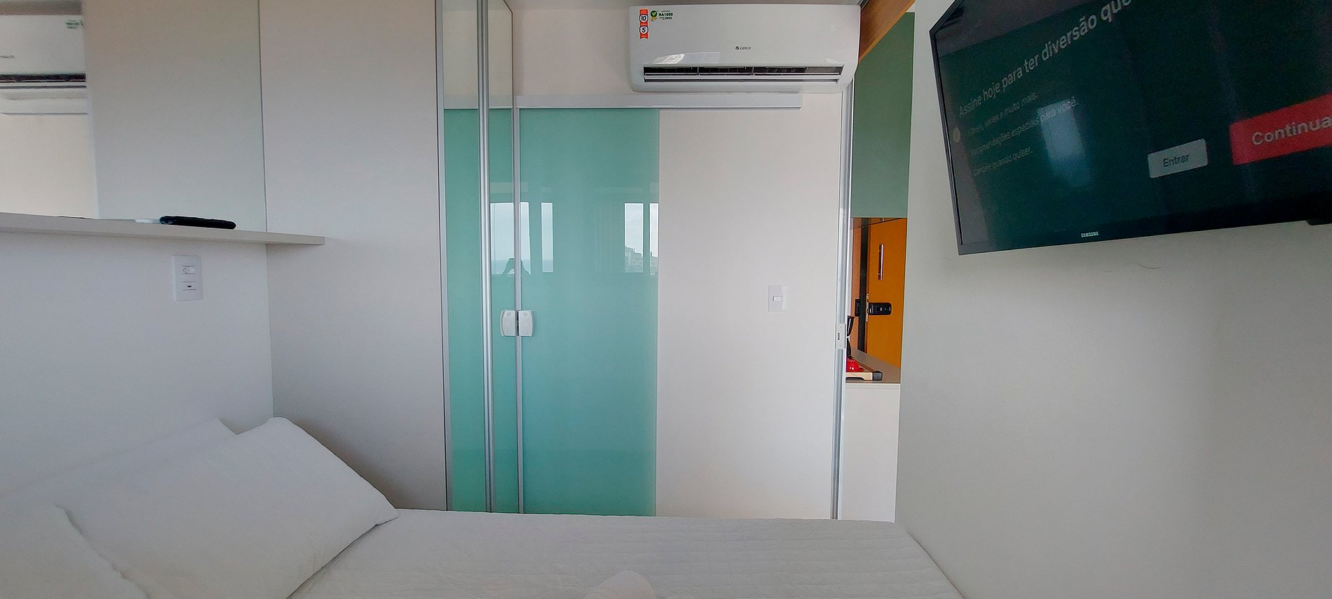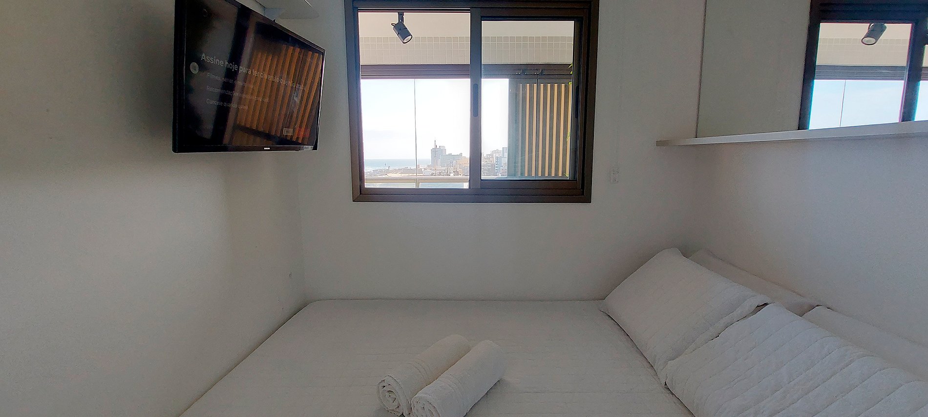 ¡Dormitorio y sala de estar con vista al mar, nuevos y bien decorados en Costa Azul! Con cama de matrimonio, smart TV en salón y dormitorio, sofá cama doble (ver fotos del mismo abiertas antes de reservar), aire acondicionado split y cocina completa. Condominio con conserje las 24 horas, gimnasio, piscina y lavandería (se paga aparte).