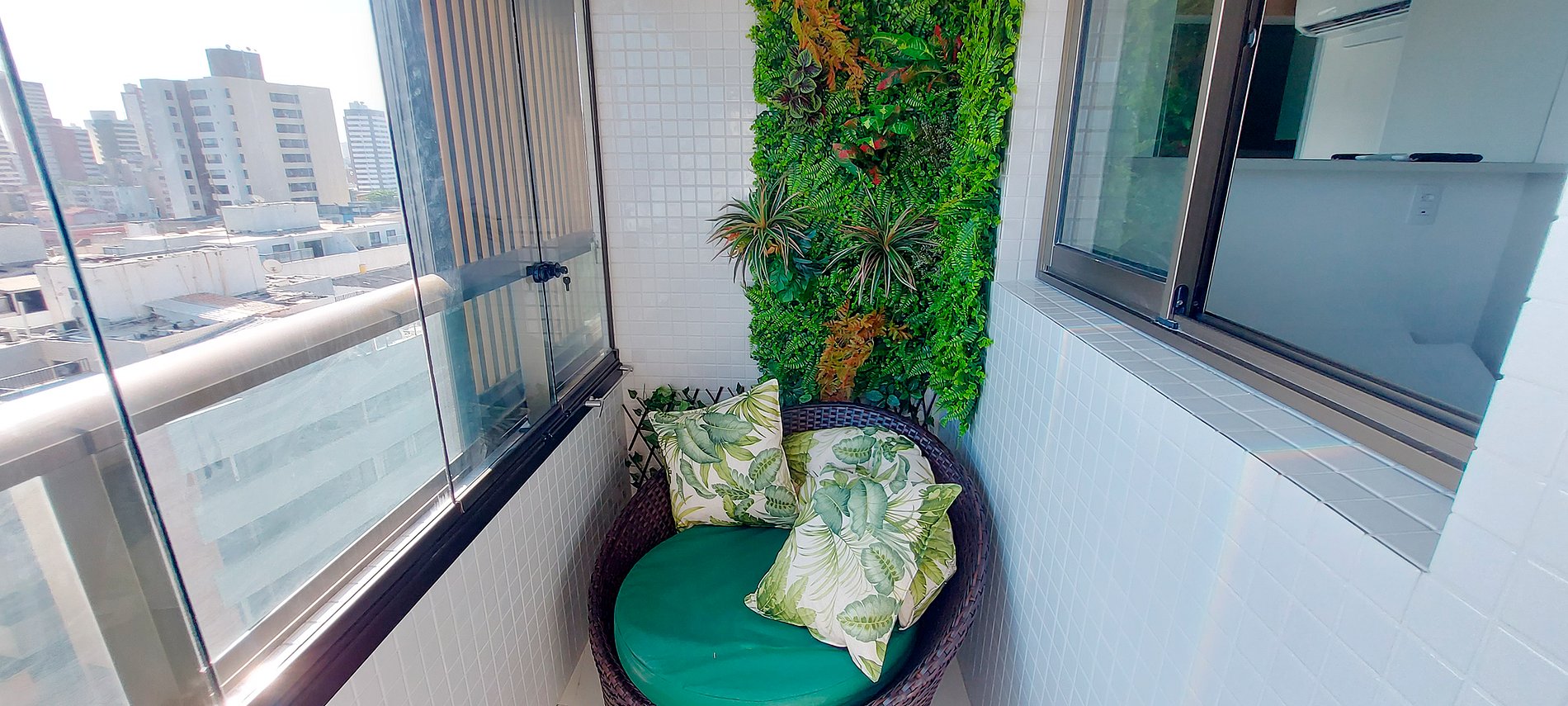 - Balcón con ventana estilo Reiki, mesa de madera con dos sillas, sillón acolchado, banco con elementos decorativos.
