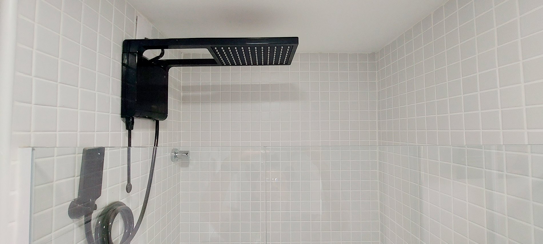 - Baño con ducha eléctrica, mampara de cristal, lavabo con espejo y mueble.