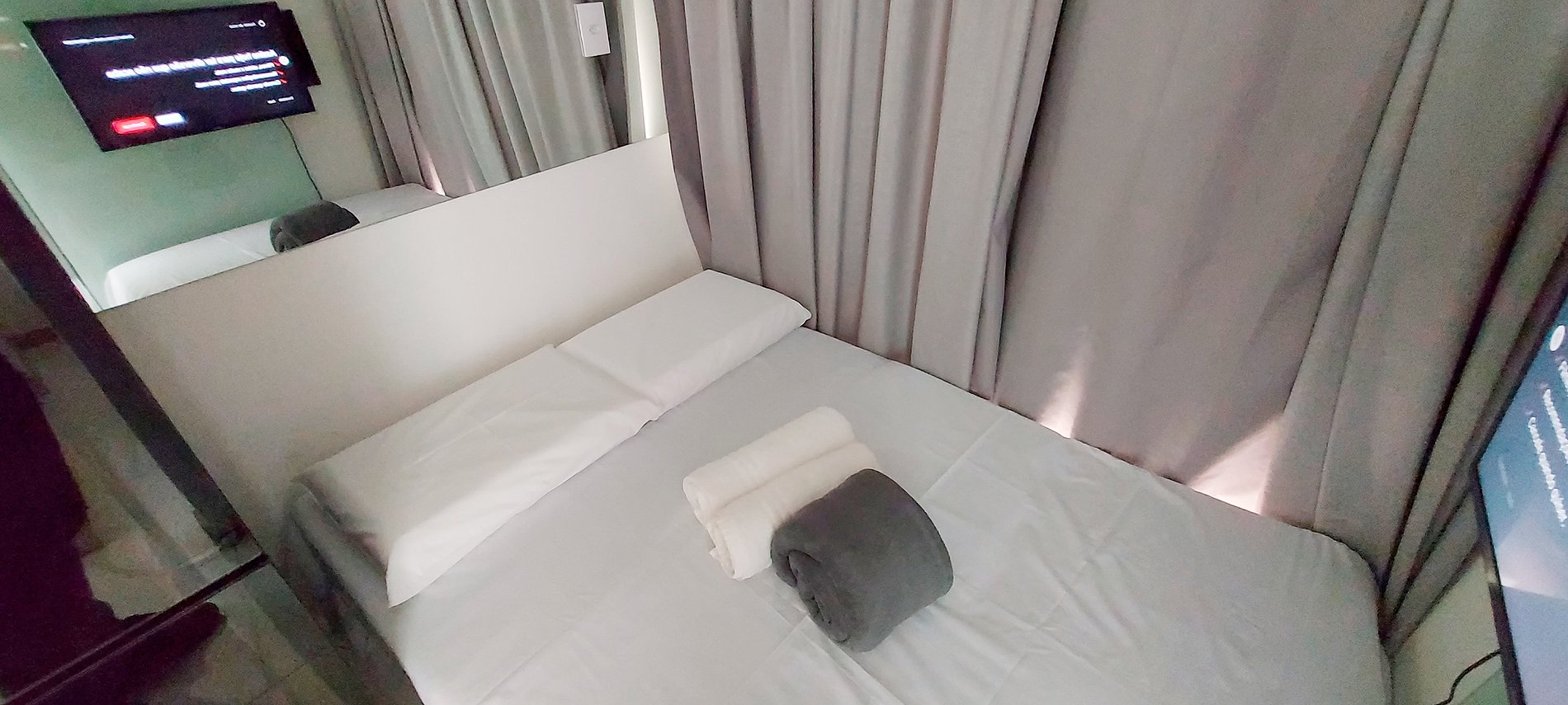 - Dormitorio con cama matrimonial, estantería, aire acondicionado split, smart TV con canales locales, armario, cortina blackout.