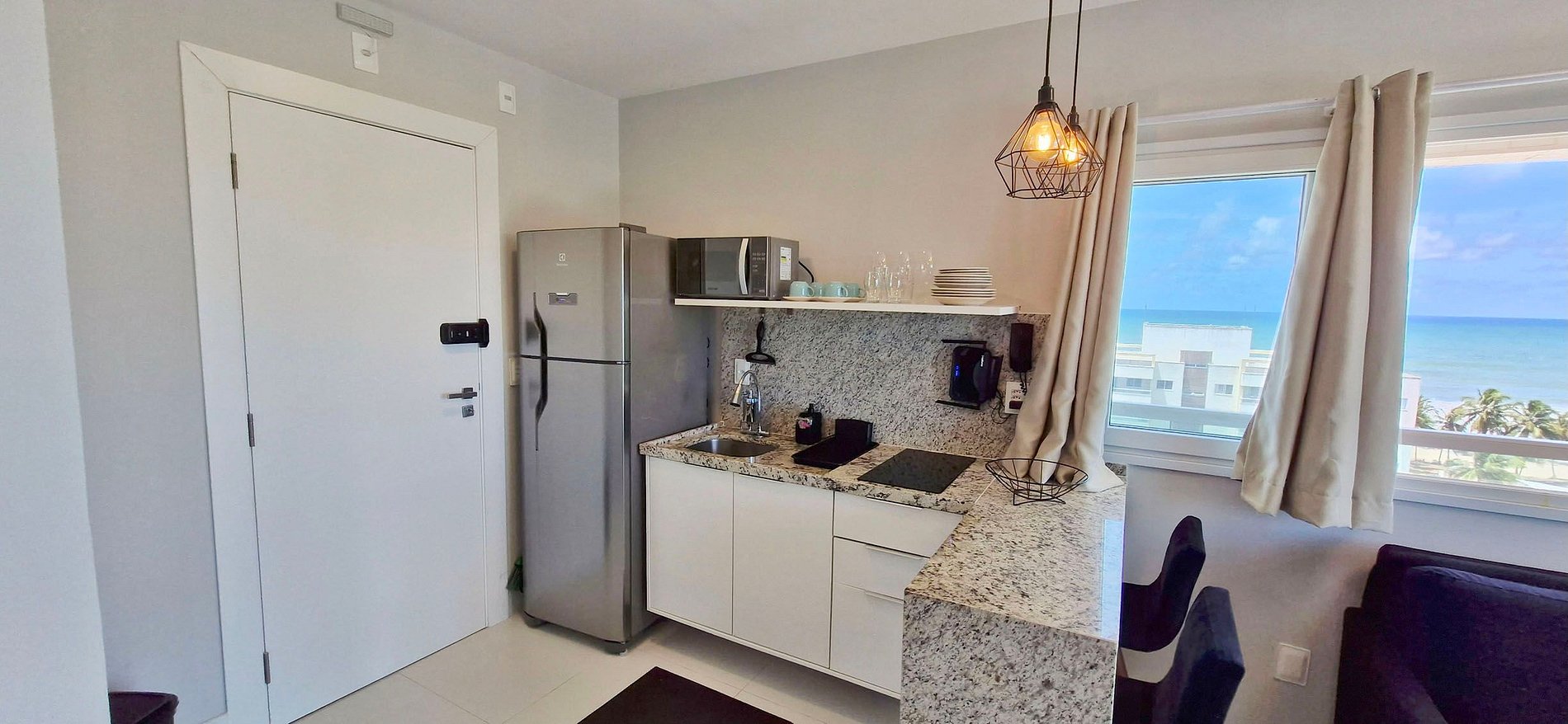 Apartamento con cama doble, sofá, Smart TV con brazo giratorio (puede ver la tv desde la cama o el sofá), aire acondicionado split, wifi, cocina, baño y balcón con vistas al mar.
