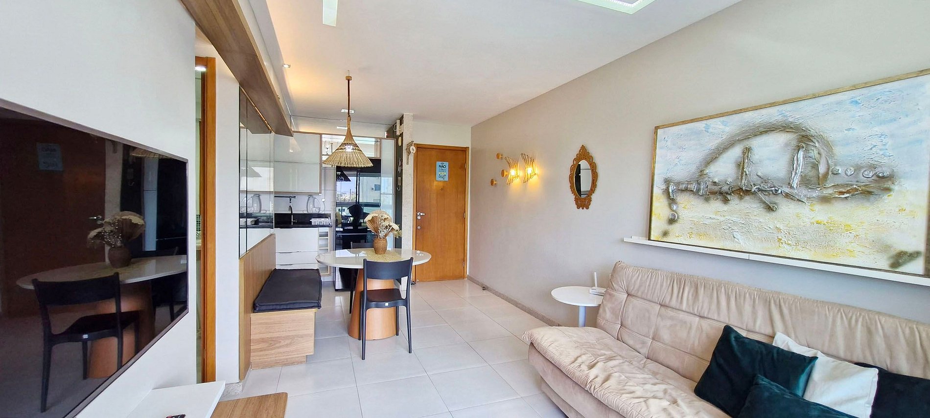 - Sala de estar con mesa de comedor, banco grande y dos sillas, espejo, sofá cama individual, mesa auxiliar redonda, estante con SMART TV y canales locales, wifi, luces LED, cortinas transparentes y cuadros decorativos.