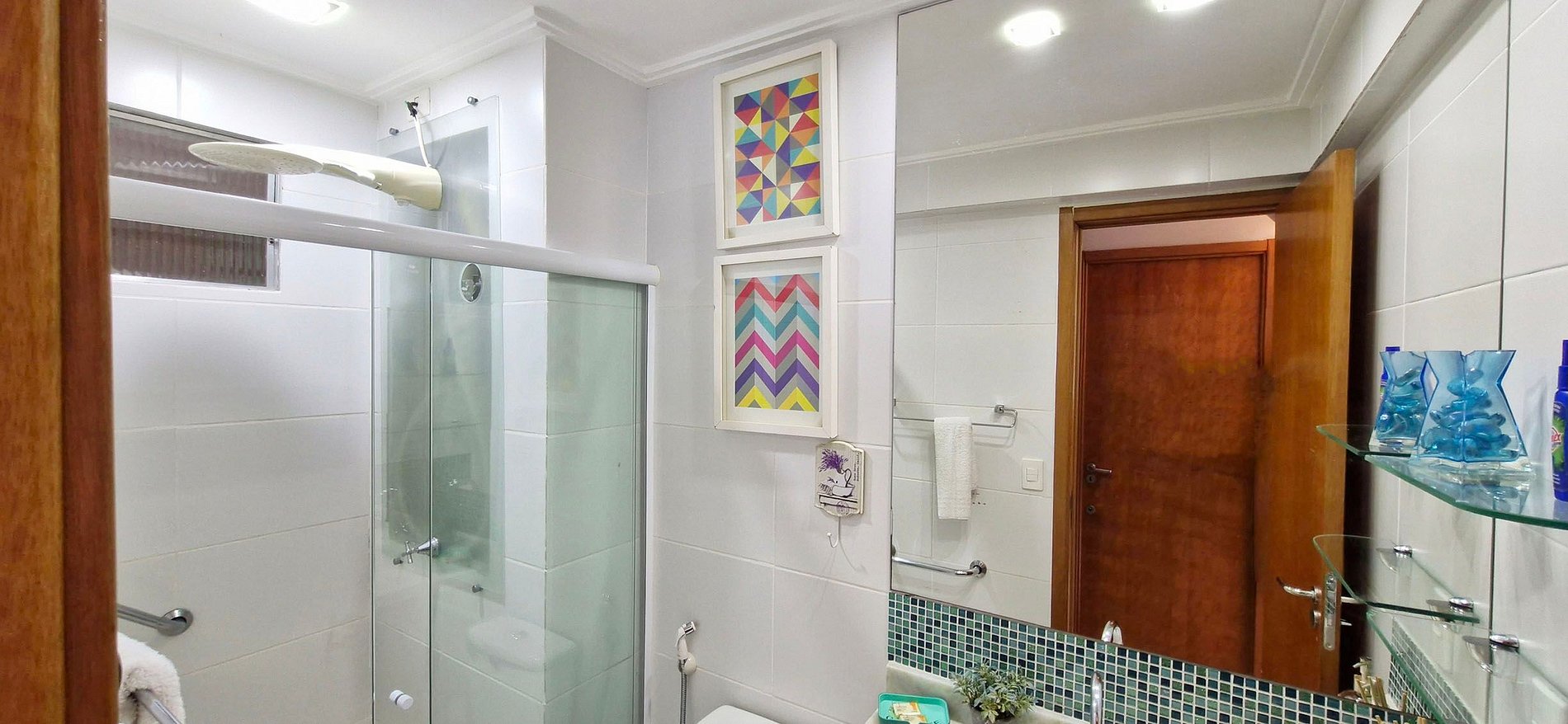 - Baño con cabina de ducha, ducha eléctrica y espejo.