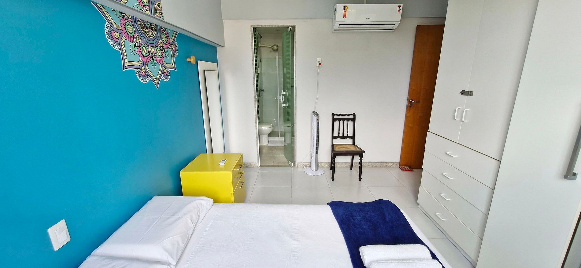 - Suite con cama doble, mesita de noche con cajones, armario, plancha, aire acondicionado split, cortinas (no opacas), espejo grande, ventilador y dos sillas. BAÑO con cabina de ducha, lavabo, espejo y ducha eléctrica. (La puerta del baño es de cristal, ver fotos).