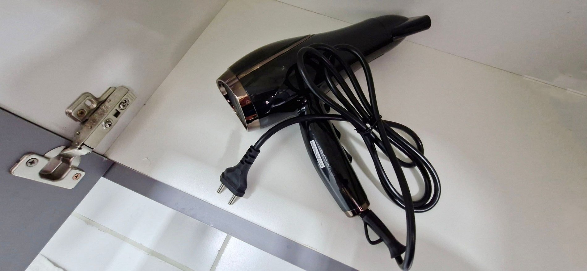 - Baño con armario, espejo, secador de pelo, cabina de ducha y ducha eléctrica.