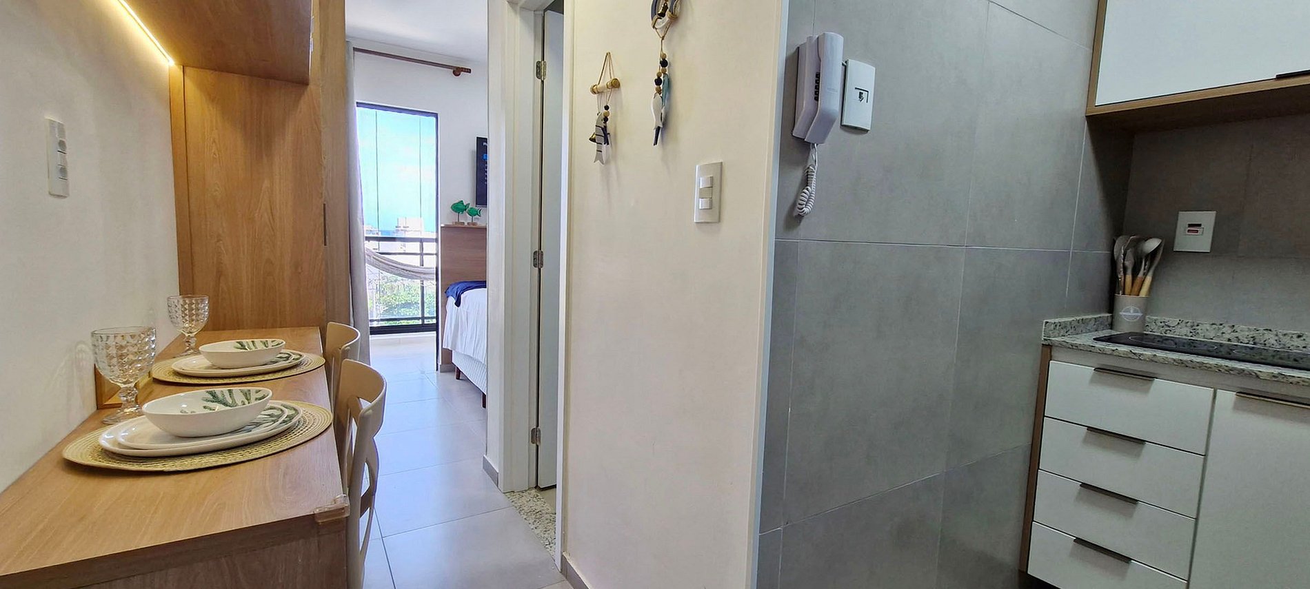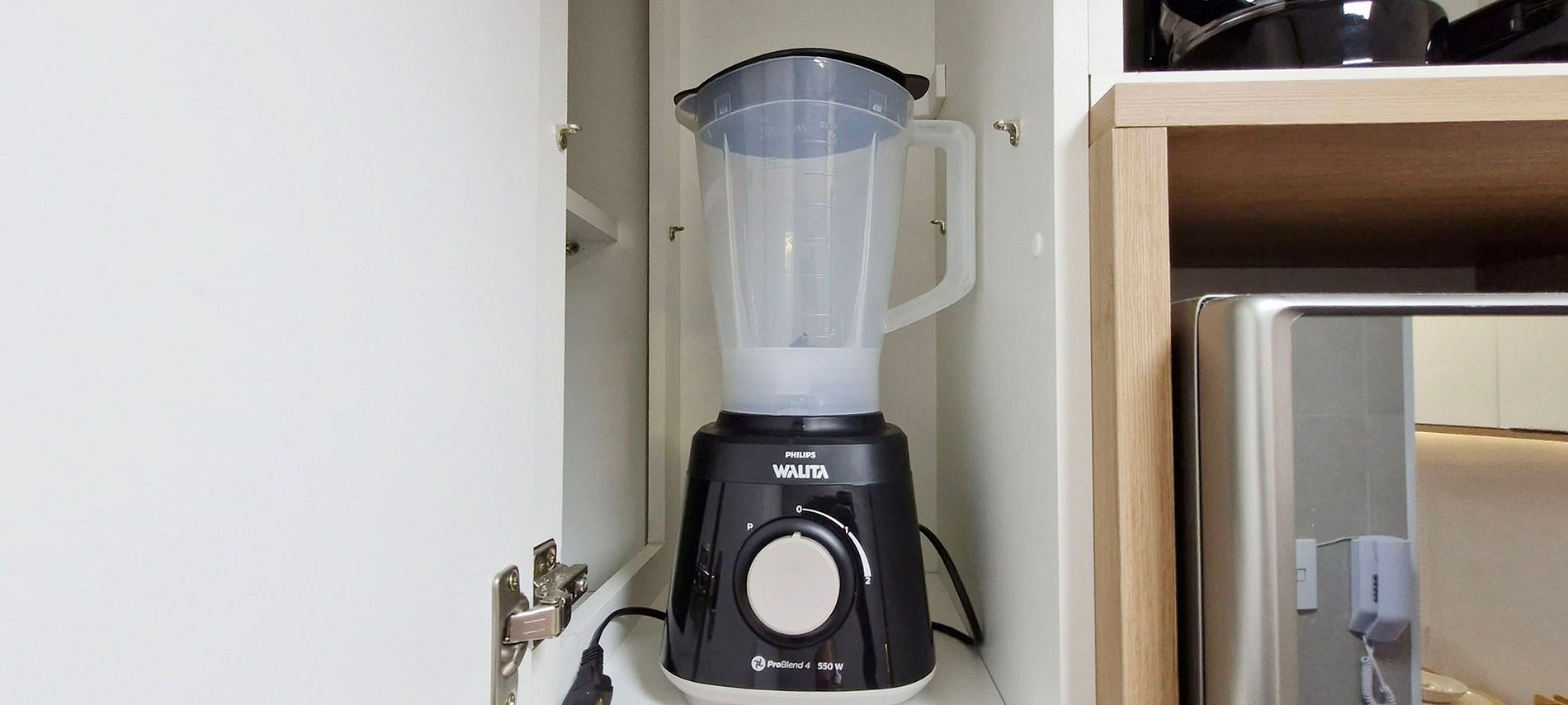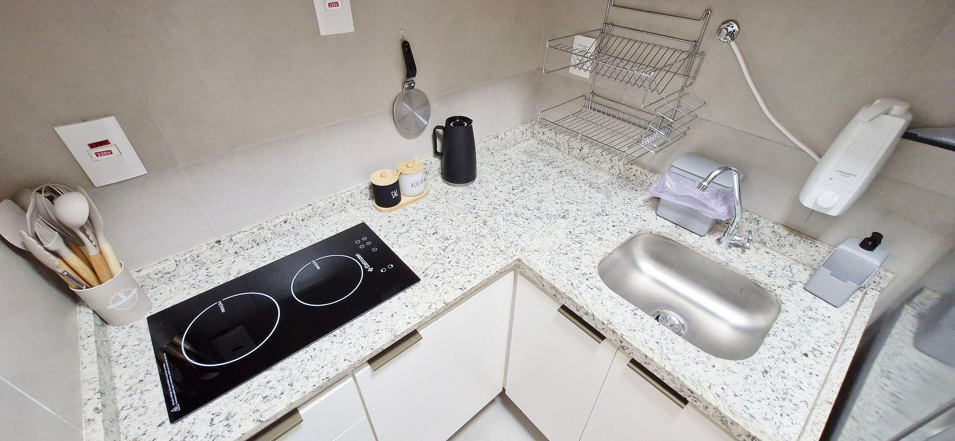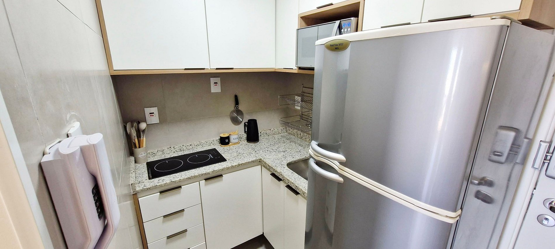 - Cocina equipada con batidora, sandwichera, cafetera eléctrica, refrigerador de dos puertas, placa de inducción de 2 quemadores, microondas, filtro de agua y diversos utensilios de cocina.