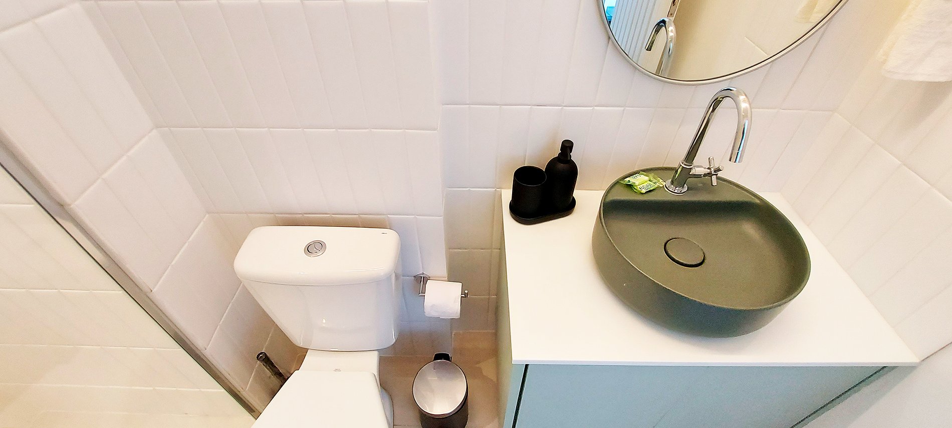 • No se pueden arrojar desechos sólidos por el inodoro (incluido el papel higiénico), use el contenedor provisto. De lo contrario, el inodoro podría atascarse y cobramos BRL 150 para desatascarlo.